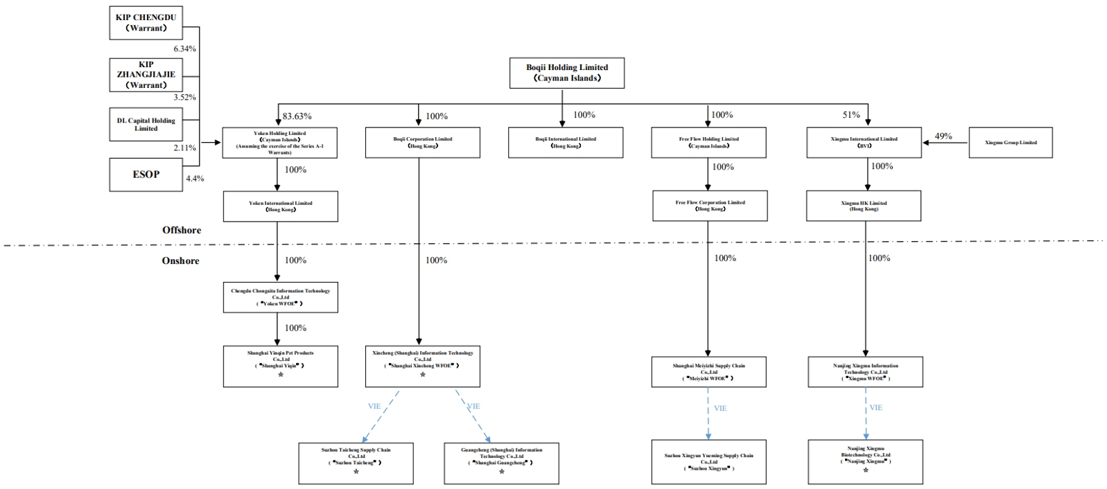 此次发行中购买证券的投资者购买的是开曼群岛控股公司BOQII HOLDING LIMITED的证券,而不是BOQII HOLDING LIMITED的子公司或在中国开展实质性业务的可变利益实体(VIE)的证券。我们在中国的业务是通过我们的中国子公司以及通过与VIE的合同安排进行的。这些合同安排尚未在法庭上得到检验。VIE结构用于为投资者提供对中国公司的外国投资敞口,而中国法律禁止外国对运营公司的直接投资。这种结构给投资者带来了独特的风险,投资者可能永远不会持有中国运营公司的股权。中国监管当局可能不允许这种结构,这可能会导致我们的运营发生重大变化和/或我们正在登记出售的证券价值发生重大变化,包括可能导致此类证券的价值大幅下降或变得一文不值。参见“风险因素——与在中国开展业务相关的风险。”波奇宠物并非一间中国营运公司,而是一间于开曼群岛注册成立的控股公司。因为波奇宠物自己没有重大业务,我们所有的业务都是通过我们的中国或中国大陆以及香港子公司和可变利益实体(“VIE”)进行的。有关我们公司结构的描述,请参阅“我们的历史和公司Structure。”