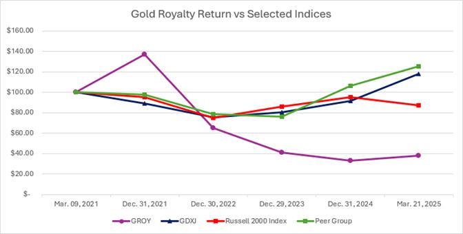 | i. | 总收入、土地协议收益和利息是通过将记入其他矿产权益的土地协议收益和与黄金挂钩的贷款所赚取的利息与总收入相加而确定的。我们纳入了这些信息,因为管理层认为某些投资者使用这些信息来评估我们与贵金属开采行业其他黄金特许权使用费公司相比的表现。 |