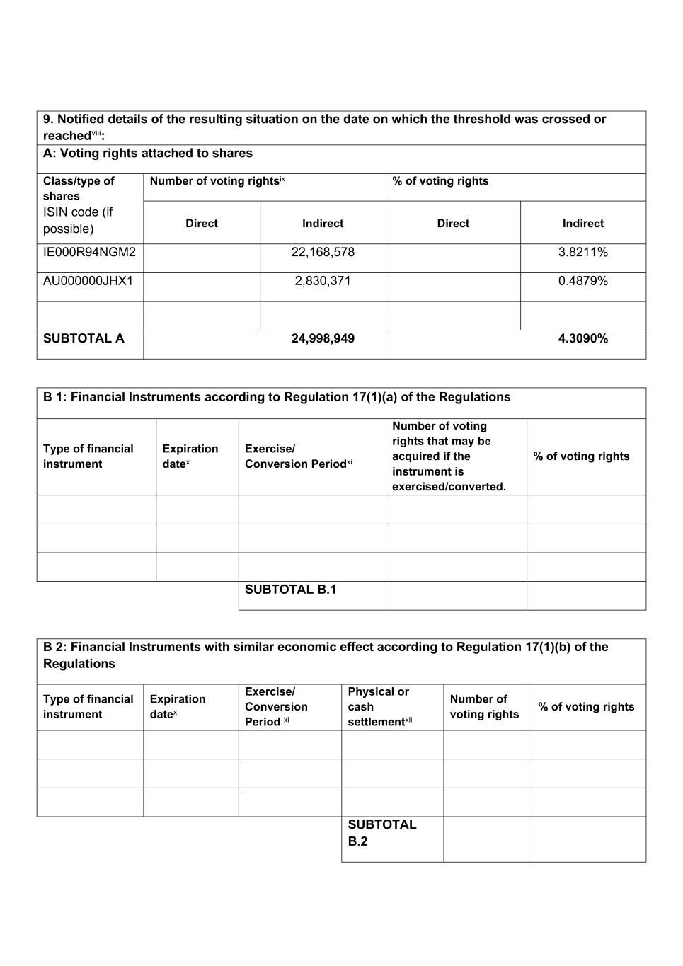 9.超过或达到阈值之日所产生情况的通知详情viii:A:股份附带的表决权股份类别/类型ISIN代码(如可能)表决权数量表决权的6%直接间接直接间接IE000R94NGM2 22,168,5783.8211% AU000000JHX1 2,830,3710.4879%小计A24,998,9494.3090% B1:金融工具根据《规章》第17(1)(a)条规定的金融工具类型到期日前行使/转换期间xi如果该工具被行使/转换可能获得的表决权数量。投票权百分比小计b.1 b2:根据条例第17(1)(b)条具有类似经济效果的金融工具金融工具类型到期日ex行使/转换期xi实物或现金结算xii投票权数%投票权小计b.2