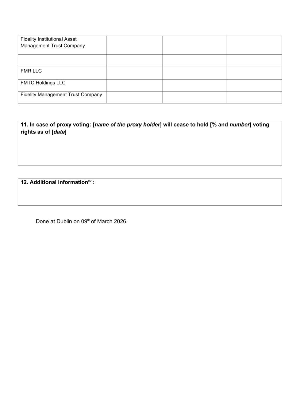 富达机构资产管理信托公司FMR LLC FMTC Holdings LLC富达管理信托公司11。如为代理投票:[代理持有人名称]自[日期] 12日起停止持有[ %及数目]投票权。附加信息xvi:于2026年3月9日在都柏林完成。