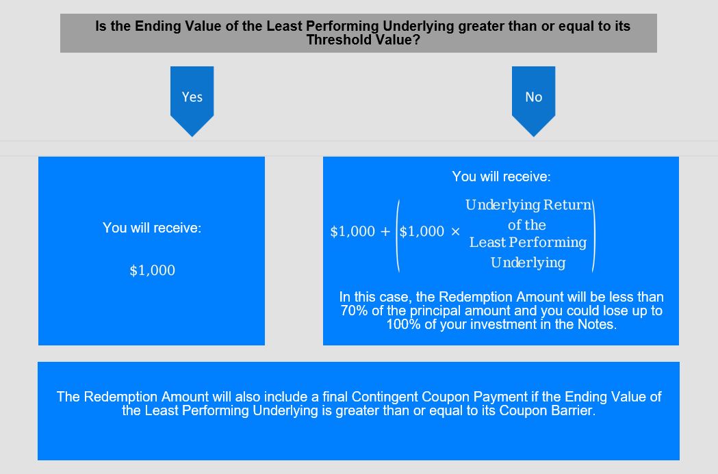| ● | 假设票据在到期前未被赎回,如果任何 潜在跌幅超过30%,到期时,您的投资将受到表现最差的基础资产价值下降的1:1的下行风险敞口,最多可达100风险本金的%;否则,到期时您将收到本金金额。到期时,您还将获得最终的特遣队如果收盘价为每个 最终观察日的基础大于或等于70初始值的%。 |