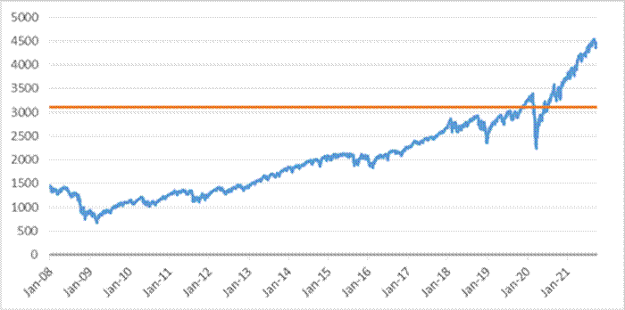 下图列出了SPX在2008年1月1日至定价日期间的每日历史表现。我们是从彭博新闻社获得这一历史数据的,我们还没有独立验证从彭博新闻社获得的信息的准确性或完整性,图中的水平线代表SPX的息票屏障和阈值3,110.18(四舍五入到小数点后两位),这是SPX初始值4,443.11的70%。