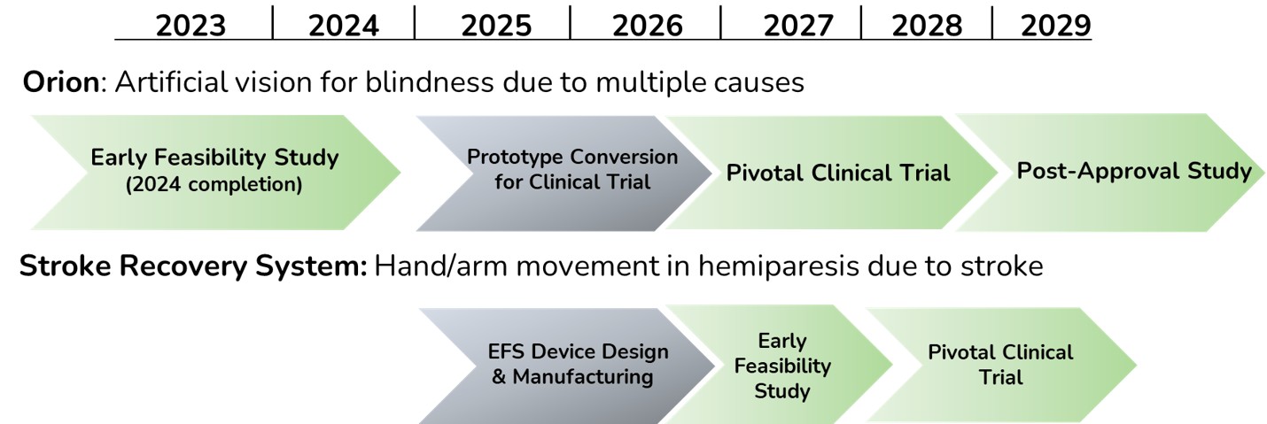 基于我们的神经刺激平台,我们于2025年3月完成了一项为期六年的早期可行性研究(“EFS”),以评估一种更先进的人工视觉系统,我们称之为Orion®视觉皮质假体系统(“Orion”)。Orion旨在为那些因青光眼和糖尿病视网膜病变等最常见原因而严重失明的人提供人工视觉。Orion的可寻址患者群体估计约为Argus II的20倍。我们的目标是在大约18个月内开始Orion的关键临床试验,以支持向FDA申请上市批准。