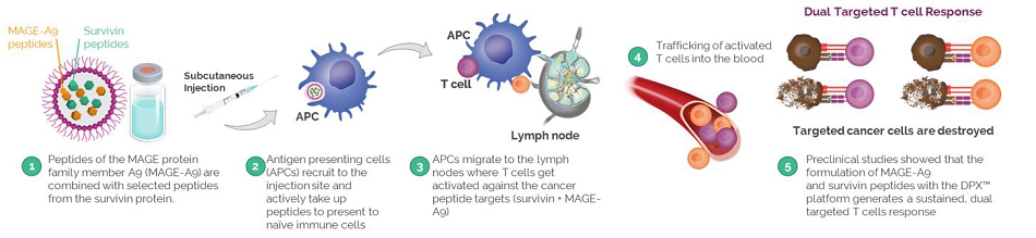 MVP-S是我们第一个基于DPX的免疫疗法,旨在激发对Survivin的特定免疫反应;一种在许多晚期癌症中通常过度表达的蛋白质。MVP-S由来自Survivin蛋白的肽、激活CD4 T“辅助”细胞的肽和先天免疫细胞的激活剂组成。这些成分中的每一个的包含共同引发了幸存者特异性CD8“杀手”T细胞的强大、持续诱导,这些T细胞在身体中巡逻以寻找并特异性根除表达幸存者的癌细胞。