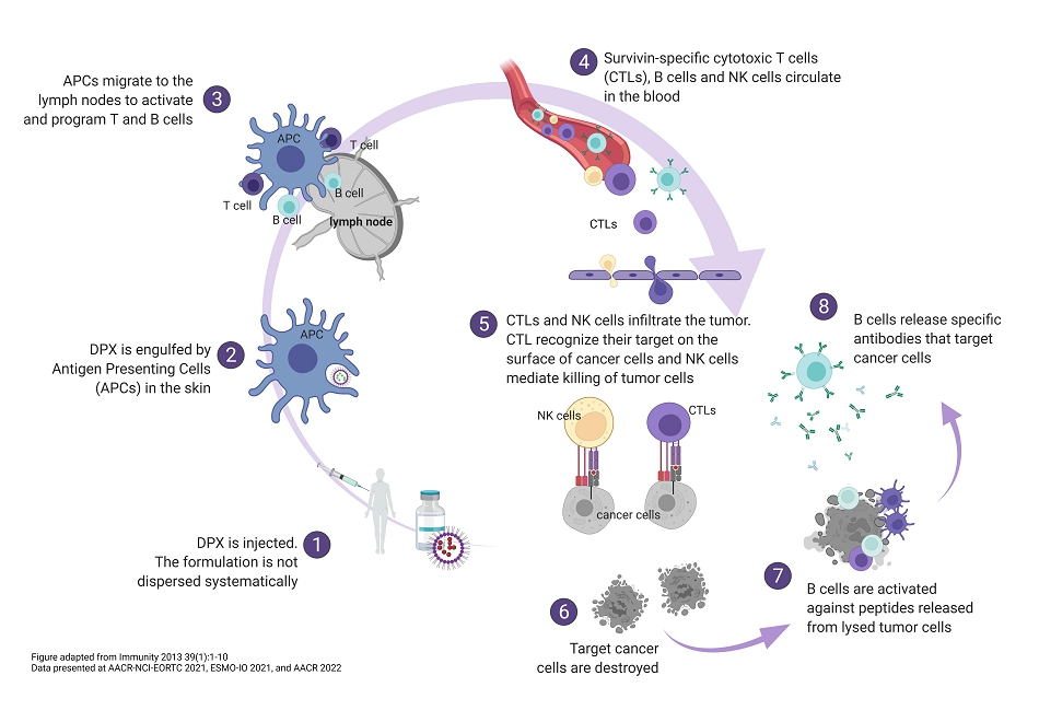 当与肿瘤相关抗原配制时,基于DPX的免疫疗法旨在维持注射部位的抗原,以延长与免疫系统的相互作用,诱导抗原特异性细胞毒性T细胞的强大扩增并抑制荷瘤中的肿瘤生长模型。在临床试验中,基于DPX的免疫疗法(单独给药或与其他药物联合给药)通过不频繁、低容量注射且耐受性良好(即最常见的1级或2级注射部位反应)实现了稳健、持续的免疫反应。在临床上,我们的先导化合物已被证明可以引发并增加T和B细胞对肿瘤的浸润。最近,我们公布了临床/转化研究和临床前模型的结果,表明除了先前公认的T和B细胞在DPX介导的免疫治疗抗肿瘤活性功效中的作用外,NK细胞还具有独特的作用。在AACR 2022上展示的海报是 可在我们的网站上查看 4.