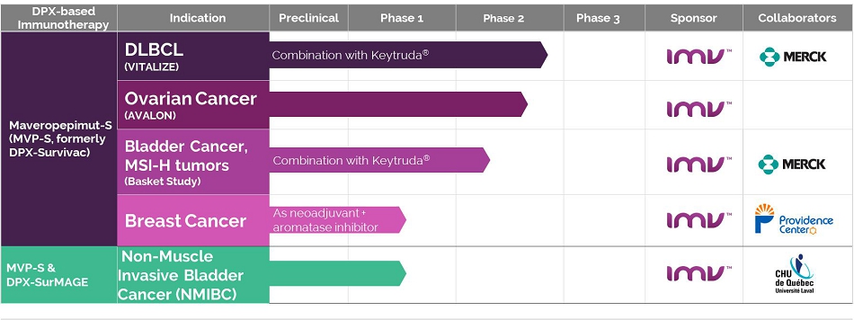 基于DPX的免疫疗法的研究结果已在临床前肿瘤模型和晚期癌症人类中显示出强大且持续的抗原特异性T细胞活性。值得注意的是,临床前和早期临床研究表明,基于DPX的免疫疗法还可以在抗癌反应中招募其他免疫细胞类型,包括B细胞和NK细胞。IMV的免疫教育疗法具有良好的耐受性,并且可以很容易地与其他免疫治疗方法(包括CPI)结合使用。