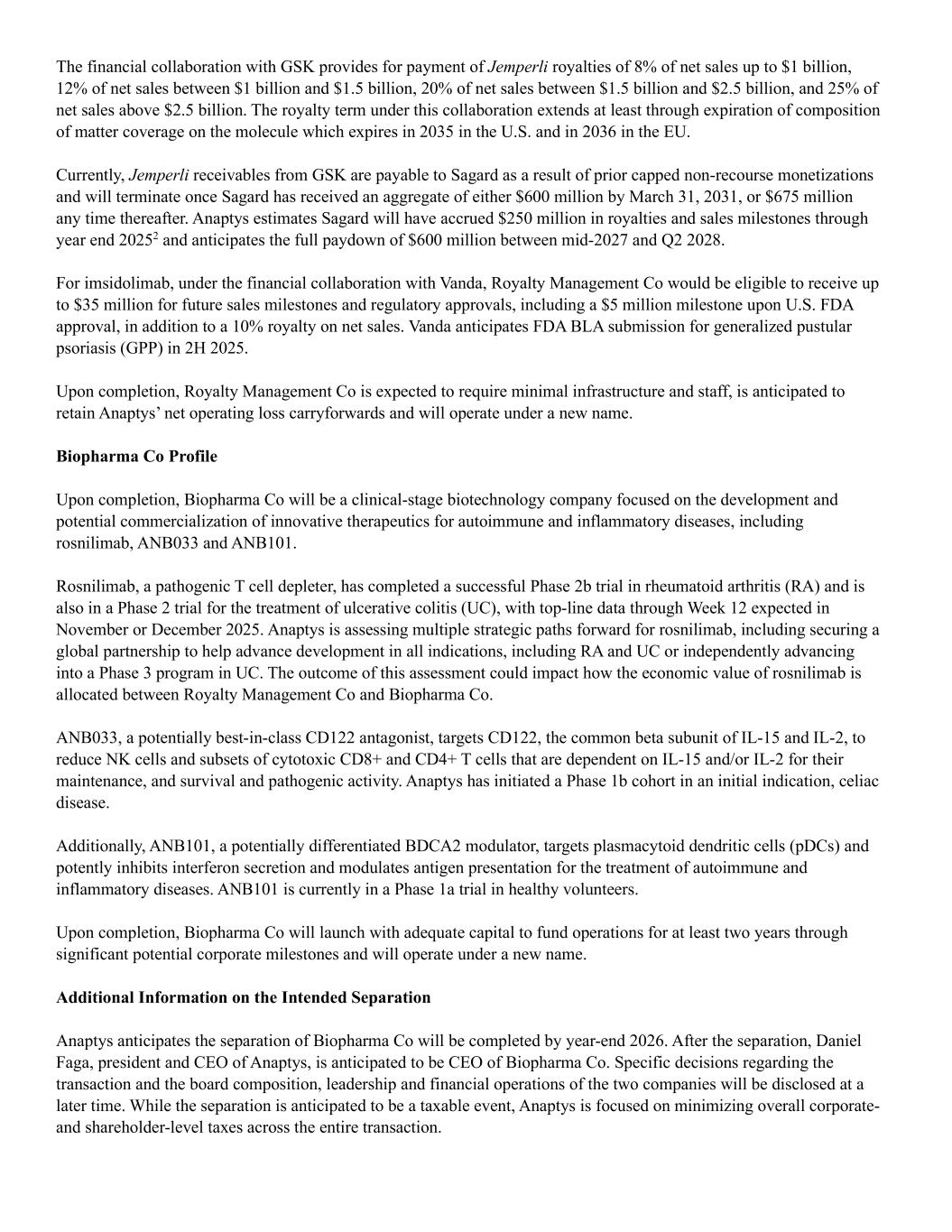 与GSK的财务合作规定支付Jemperli特许权使用费为净销售额的8%至多10亿美元,净销售额在10亿至15亿美元之间的12%,净销售额在15亿至25亿美元之间的20%,净销售额在25亿美元以上的25%。这项合作下的特许权使用费期限至少通过该分子的物质覆盖成分到期而延长,该成分在美国将于2035年到期,在欧盟将于2036年到期。目前,来自GSK的Jemperli应收账款是由于先前有上限的无追索权货币化而支付给Sagard的,一旦Sagard在2031年3月31日之前收到总计6亿美元或此后任何时间收到6.75亿美元,这些应收账款将终止。Anaptys估计,Sagard将在20252年底之前积累2.5亿美元的特许权使用费和销售里程碑,并预计在2027年年中至2028年第二季度期间将全额偿还6亿美元。对于imsidolimab,根据与Vanda的财务合作,Royalty Management Co将有资格获得高达3500万美元的未来销售里程碑和监管批准,包括美国FDA批准后的500万美元里程碑,此外还有10%的净销售额特许权使用费。万达预计将于2025年2月向FDA提交针对广泛性脓疱性银屑病(GPP)的BLA。完成后,版税管理公司预计将需要最少的基础设施和人员,预计将保留Anaptys的净运营亏损结转,并将以新的名称运营。Biopharma Co简介完成后,Biopharma Co将是一家临床阶段的生物技术公司,专注于自身免疫和炎症性疾病创新疗法的开发和潜在商业化,包括rosnilimab、ANB033和ANB101。Rosnilimab是一种致病性T细胞消耗剂,已成功完成类风湿性关节炎(RA)的2b期试验,并且还处于治疗溃疡性结肠炎(UC)的2期试验中,预计将于2025年11月或12月获得截至第12周的一线数据。Anaptys正在评估rosnilimab的多个战略路径,包括建立全球合作伙伴关系,以帮助推进所有适应症的开发,包括RA和UC或独立推进UC的3期项目。这项评估的结果可能会影响Rosnilimab的经济价值如何在Royalty Management Co和BioPharma Co.之间分配。ANB033是一种潜在的同类最佳CD122拮抗剂,靶向CD122,IL-15和IL-2的常见β亚基,以减少依赖IL-15和/或IL-2维持的NK细胞和细胞毒性CD8 +和CD4 + T细胞亚群,以及存活和致病活性。Anaptys已在初步适应症乳糜泻中启动了1b期队列。此外,ANB101是一种潜在分化的BDCA2调节剂,靶向浆细胞样树突状细胞(PDC),有效抑制干扰素分泌并调节抗原呈递,用于治疗自身免疫性和炎症性疾病。ANB101目前在健康志愿者中进行1a期试验。完成后,Biopharma Co将以充足的资本启动,通过重要的潜在企业里程碑为至少两年的运营提供资金,并将以新的名称运营。有关拟分离的更多信息Anaptys预计,Biopharma Co的分离将在2026年底完成。分拆后,Anaptys总裁兼首席执行官Daniel Faga预计将出任Biopharma Co.的首席执行官。有关交易以及两家公司的董事会组成、领导层和财务运营的具体决定将在稍后时间披露。虽然分离预计将是一个应税事件,但Anaptys专注于在整个交易中最大限度地减少整体公司和股东层面的税收。