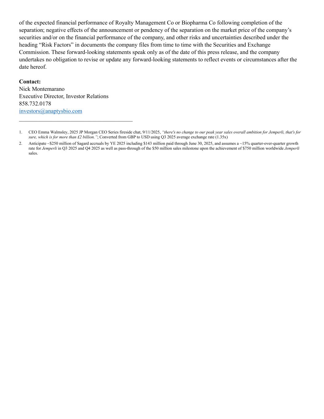 Royalty Management Co或BioPharma Co在完成分立后的预期财务业绩;分立的公告或未决对公司证券的市场价格和/或对公司财务业绩的负面影响,以及公司不时向美国证券交易委员会提交的文件中“风险因素”标题下描述的其他风险和不确定性。这些前瞻性陈述仅在本新闻稿发布之日发表,公司不承担修改或更新任何前瞻性陈述以反映本新闻稿发布之日之后的事件或情况的义务。联系人:Nick Montemarano执行董事,投资者关系858.73 2.0178 Investors@anaptysbio.com _________________________________________1。首席执行官Emma Walmsley,2025年摩根大通首席执行官系列炉边谈话,2025年9月11日,“我们对Jemperli的高峰年销售总体目标没有变化,这是肯定的,即超过20亿英镑。”;使用2025年第三季度平均汇率(1.35x)2从英镑兑换美元。预计到2025年将有约2.5亿美元的Sagard应计项目,其中包括截至2025年6月30日支付的1.43亿美元,并假设Jemperli在2025年第三季度和2025年第四季度的环比增长率约为15%,以及在实现7.5亿美元的全球Jemperli销售额后传递5000万美元的销售里程碑。