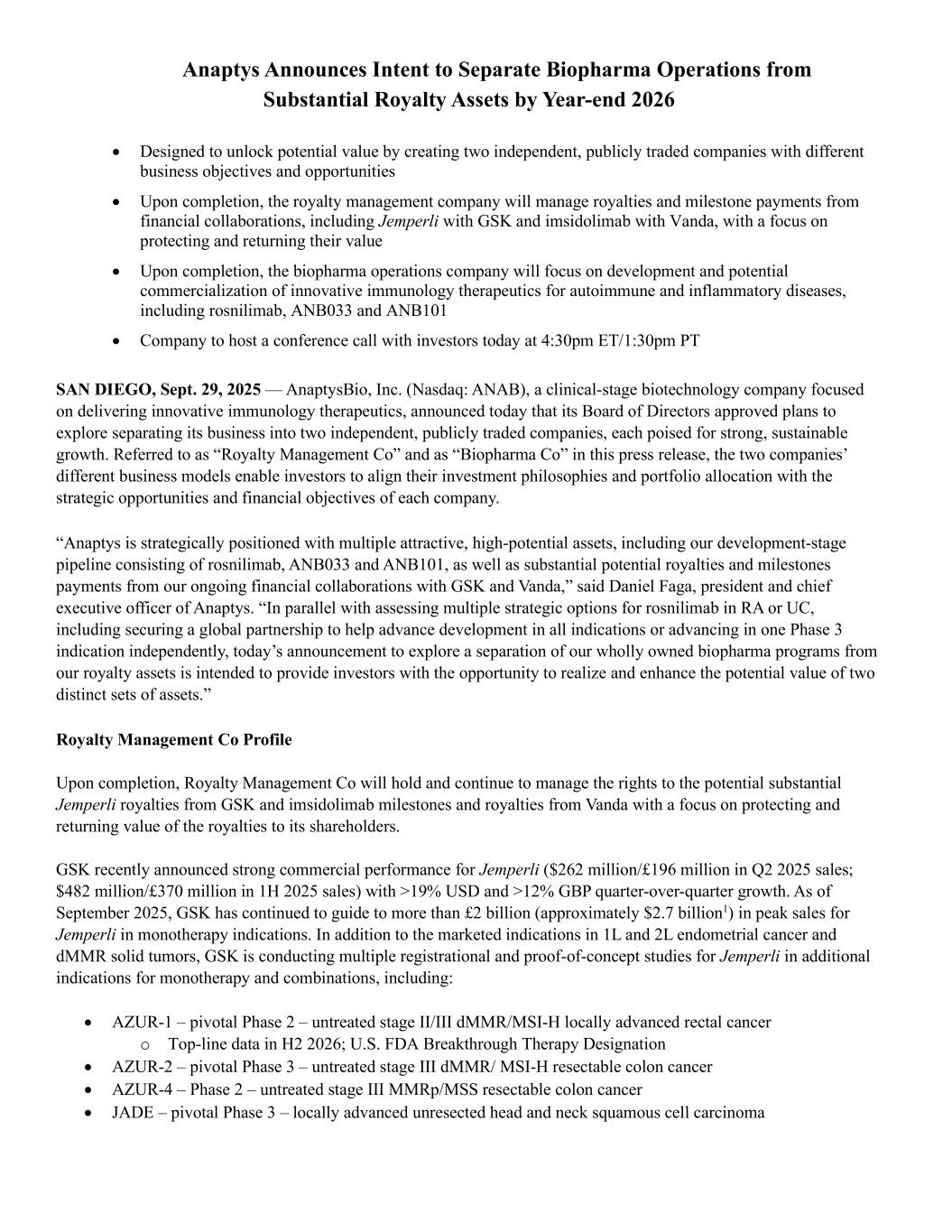 Anaptys宣布打算在2026年底前将生物制药业务与大量特许权使用费资产分开•旨在通过创建两家具有不同业务目标和机会的独立、公开上市公司来释放潜在价值•完成后,特许权使用费管理公司将管理来自金融合作的特许权使用费和里程碑付款,包括与GSK的Jemperli和与Vanda的imsidolimab,重点是保护和返还其价值•完成后,这家生物制药运营公司将专注于自身免疫和炎症性疾病的创新免疫学疗法的开发和潜在商业化,包括rosnilimab,ANB033和ANB101 •公司将于美国东部时间今天下午4:30/太平洋时间2025年9月29日下午1:30与投资者举行电话会议—— AnaptysBio,Inc.(纳斯达克:ANAB)是一家临床阶段的生物技术公司,专注于提供创新的免疫疗法,该公司今天宣布,其董事会批准了探索将其业务分离为两家独立的上市公司的计划,每家公司都有望实现强劲、可持续的增长。两家公司在本新闻稿中分别被称为“Royalty Management Co”和“BioPharma Co”,两家公司不同的商业模式使投资者能够根据每家公司的战略机遇和财务目标调整其投资理念和投资组合配置。Anaptys总裁兼首席执行官Daniel Faga表示:“Anaptys的战略定位是拥有多项具有吸引力的高潜力资产,包括我们由rosnilimab、ANB033和ANB101组成的开发阶段管道,以及我们与GSK和Vanda正在进行的财务合作产生的大量潜在特许权使用费和里程碑付款。”“在评估Rosnilimab在RA或UC中的多种战略选择的同时,包括确保建立全球合作伙伴关系以帮助推进所有适应症的开发或独立推进一个3期适应症,今天宣布探索将我们全资拥有的生物制药项目与我们的特许权使用费资产分离,旨在为投资者提供机会,以实现和提高两组不同资产的潜在价值。”版税管理公司简介完成后,版税管理公司将持有并继续管理来自GSK和imsidolimab里程碑的潜在大量Jemperli版税以及来自Vanda的版税的权利,重点是保护和向其股东返还版税的价值。GSK最近公布了Jemperli强劲的商业表现(2025年第二季度销售额为2.62亿美元/1.96亿英镑;2025年上半年销售额为4.82亿美元/3.7亿英镑),环比增长> 19%美元和> 12%英镑。截至2025年9月,GSK继续引导Jemperli在单一疗法适应症的峰值销售额超过20亿英镑(约合27亿美元1)。除了1L和2L子宫内膜癌和DMMR实体瘤的上市适应症外,GSK正在对Jemperli进行多项注册和概念验证研究,用于单药治疗和联合治疗的其他适应症,包括:• AZUR-1 –关键2期–未经治疗的II/III期dMMR/MSI-H局部晚期直肠癌o 2026年下半年的顶线数据;美国FDA突破性疗法认定• AZUR-2 –关键3期–未经治疗的III期dMMR/MSI-H可切除结肠癌• AZUR-4 – 2期–未经治疗的III期MMRp/MSS可切除结肠癌• JADE –关键3期–局部晚期未切除头颈部鳞状细胞癌