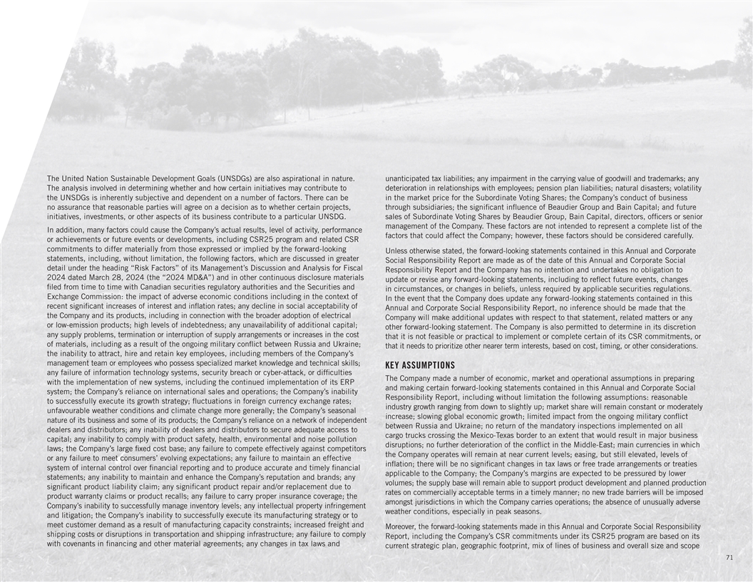 联合国可持续发展目标(UNSDGs)本质上也是令人向往的。意外的税务负债;商誉和商标账面价值的任何减值;确定某些举措是否以及如何可能导致与员工的关系恶化所涉及的任何分析;养老金计划负债;自然灾害;UNSDGs的波动性本质上是主观的,取决于许多因素。次级有表决权股份的市场价格可能存在;公司开展业务无法保证合理的各方将就是否通过子公司就某些项目达成决定;Beaudier Group和贝恩资本的重大影响;以及未来的举措、投资或其业务的其他方面对特定UNSDG的贡献。Beaudier Group、贝恩资本、公司董事、高级管理人员或高级管理人员出售次级有表决权股份。这些因素并非旨在代表一份完整的清单,此外,许多因素可能导致公司的实际结果、活动水平、业绩因素可能对公司产生影响;但是,这些因素应仔细考虑。或成就或未来事件或发展,包括CSR25计划和相关CSR承诺与前瞻性明示或暗示的内容存在重大差异,除非另有说明,本年度和公司声明中包含的前瞻性陈述,包括但不限于以下因素,在更大的社会责任报告中讨论的内容是在其管理层讨论和分析财政责任报告的“风险因素”标题下于本年度和公司社会细节日期作出的,公司无意也不承担任何义务在2024年3月28日的2024年(“2024年MD & A”)和其他持续披露材料中更新或修改任何前瞻性陈述,包括反映未来事件、不时向加拿大证券监管机构和证券提交的变更以及情况,或信念的变化,除非适用的证券法规要求。交易委员会:不利经济条件的影响,包括如果公司确实更新了最近利率和通货膨胀率显着上升中包含的任何前瞻性陈述;年度和企业社会责任报告的任何社会接受度下降,不应推断公司及其产品,包括与更广泛采用电气公司有关的将对该声明、相关事项或任何或低排放产品进行额外更新;高负债水平;任何无法获得额外资本;其他前瞻性陈述。公司还被允许酌情确定任何供应问题、供应安排的终止或中断或成本的增加,即执行或完成其某些CSR承诺或材料不可行或不实际,包括由于俄罗斯和乌克兰之间持续的军事冲突;它需要根据成本、时间安排或其他考虑因素优先考虑其他近期利益。无法吸引、雇用和留住关键员工,包括公司管理团队成员或拥有专门市场知识和技术技能的员工;关键假设信息技术系统出现任何故障、安全漏洞或网络攻击,或遇到困难公司在准备实施新系统时做出了多项经济、市场和运营假设,包括继续实施其ERP并做出本年度和公司社会制度中包含的某些前瞻性陈述;公司对国际销售和运营的依赖;公司无力责任报告,包括但不限于以下假设:合理成功执行其增长战略;外币汇率波动;行业增长从下降到略有上升不等;市场份额将保持恒定或适度不利的天气条件和更普遍的气候变化;公司的季节性增长;全球经济增长放缓;受其业务和部分产品持续的军事冲突性质的影响有限;公司依赖俄罗斯和乌克兰之间的独立网络;对所有经销商和分销商实施的强制检查没有退回;经销商的任何无力和分销商,以确保有足够的通道让货运卡车穿越墨西哥-得克萨斯边境,达到将导致主要商业资本的程度;任何无法遵守产品安全、健康, 环境和噪音污染中断;中东冲突没有进一步恶化;法律适用的主要货币;公司庞大的固定成本基础;任何未能与公司经营的竞争对手进行有效竞争的情况都将保持在接近当前的水平;有所缓解,但仍处于高位,水平或任何未能满足消费者不断变化的期望;任何未能保持有效的通货膨胀;税法或自由贸易安排或条约制度对财务报告的内部控制不会有重大变化,也不会产生适用于公司的准确和及时的财务;预计公司的利润率将因报表减少而承压;任何无法维持和提高公司的声誉和品牌;任何数量;供应基础将仍然能够支持产品开发和计划生产的重大产品责任索赔;任何重大产品维修和/或及时更换因商业可接受条款的费率;不会对产品保修索赔或产品召回施加新的贸易壁垒;任何未能携带适当的保险范围;公司开展业务的司法管辖区之间;不存在异常不利的公司无法成功管理库存水平的情况;任何侵犯知识产权的天气条件,尤其是在旺季。和诉讼;公司由于制造能力限制而无法成功执行其制造战略或满足客户需求;运费增加,此外,本年度和企业社会责任航运成本或运输和航运基础设施中断中的前瞻性陈述;任何未能遵守报告,包括公司在其CSR25计划下的CSR承诺均基于其与融资和其他重大协议中的约定;税法和当前战略计划、地理足迹、业务线组合以及总体规模和范围的任何变化71