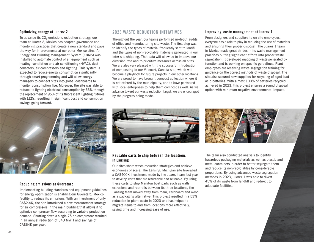 优化Juarez的能源2改善Juarez的废物管理1 2023年减少废物的举措以推进其CO减排战略,我们从设计师和供应商到现场员工,2全年,我们的团队在Juarez 2执行了深入的审计团队,墨西哥已经采取了治理措施,每个人都可以在减少办公和制造现场废物的材料使用方面发挥作用。第一步是监测创造新标准的做法,并对其进行铺垫和确保妥善处置。The Juarez 1 team to identify the types of materials frequently sent to subfill for improvement in our other Mexico sites for improvement。墨西哥的AN在其废物管理方面取得了长足进步,我们的能源和建筑管理系统(EBMS)中产生的不可回收材料类型是在适当的废物跨站点运输方面投入大量努力的做法。这些数据将使我们能够改进我们的安装,以自动控制所有设备,例如隔离。它开发了由分流率产生的废物的地图,并在所有站点优先采取措施。供暖、通风和空调(HVAC)、粉尘功能,并正在制定具体的指导方针。植物我们也很高兴引进收集器成功,空气压缩机和照明。这一系统是员工正在我们位于加拿大瓦尔库特的工厂接受用于堆肥的废物分离培训,这将有望显着降低能源消耗,为正确的废物处理方法提供指导。The become a playbook for future projects in our other locations. Through smart programming and will allow energy site also secured new suppliers for recycling aged lead We are proud to have brought compost collection where it managers to connect sites into global dashboWith almost 100% of batteries recycled is not offered by the municipal,and to have partnered monitor consumption live。此外,该场地能够在2023年实现,这个项目确保与当地企业的健全处置,以帮助他们也堆肥。由于我们通过选择将其照明电气消耗降低55%,对环境的负面影响最小。向我们的废物减少目标前进,我们被鼓励通过正在取得的进展来替换其95%的荧光照明灯具。与LED一起,导致未来显着的成本和消耗节省。该团队还进行了分析,以确定可重复使用的推车,以便在危险包装材料以及塑料和兰辛金属容器之间的地点之间运输,以便更好地将它们分开。我们的站点共享减少废物的策略,并以相当大的规模经济实现和减少其不可回收物。密歇根州兰辛市的地块发挥了杠杆作用。通过使用Juarez团队去年在2023年进行的一项加利福尼亚州 40万美元投资的先进废物分离方法,Juarez 1能够改道开发可回收和可重复使用的推车。通过使用其垃圾填埋场的45%的废物并将其重定向到这些推车以运送墙壁等Manitou船部件,减少了Queretaro足够设施的排放。在其三个地点之间进行挤压和摩擦轨道,实施建筑标准和设备指南Lansing团队正在远离泡沫、纸板和木材以进行能源优化,这使我们位于墨西哥的Queretaro能够作为包装替代品。这个项目产生了53%的设施来减少其排放。由于2023年的投资仅减少了工厂废物,并已帮助加利福尼亚州 2.4K美元,该网站引入了一种新的测量策略,可以更有效地将项目迁移到和从位置迁移,用于主楼中的空气压缩机,这使其能够节省时间并增加使用的便利性。根据可变的生产需求优化压缩机流量。关闭一台75马力的压缩机每年可减少348MWH,每年可节省加利福尼亚州 6.4万美元。34