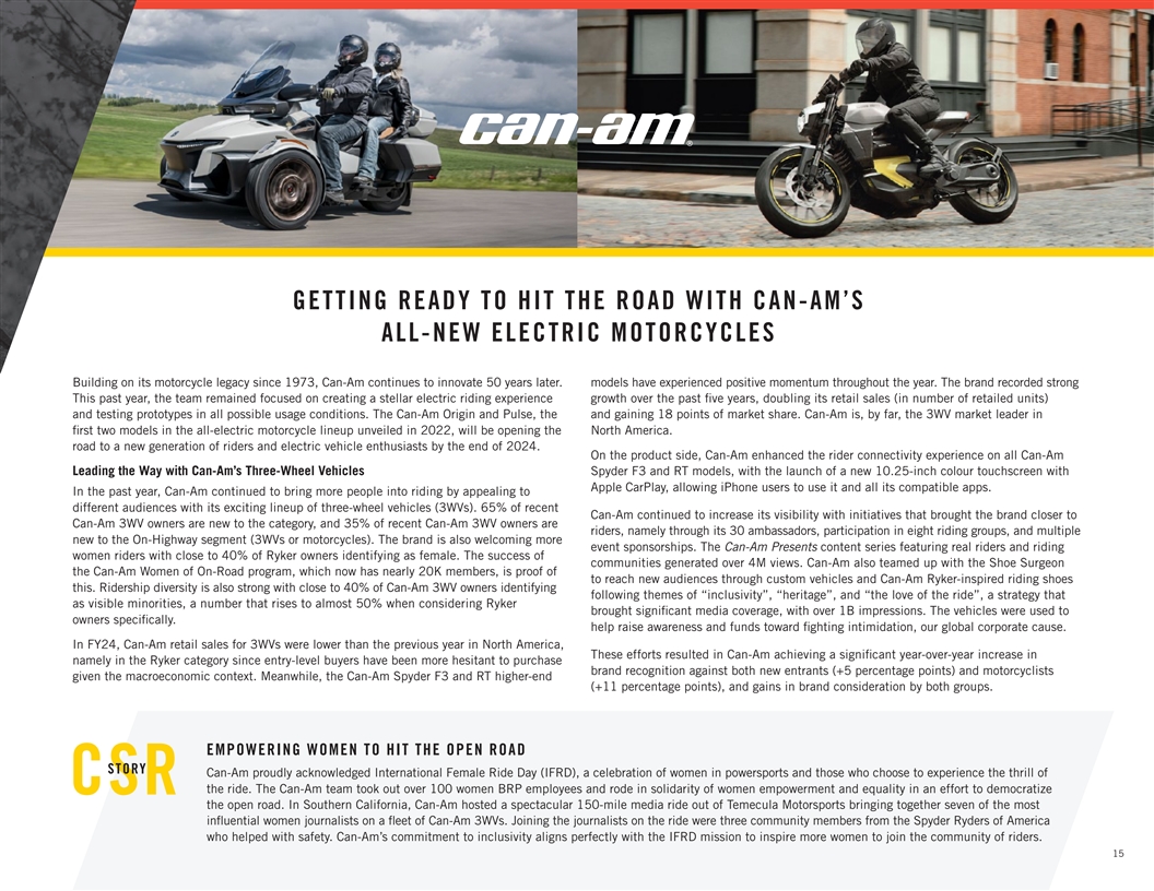 自1973年以来,Can-AM凭借其摩托车遗产打造的全新电动摩托车准备上路,50年后,Can-AM继续创新。车型在全年都经历了积极的势头。该品牌在过去一年表现强劲,该团队仍然专注于在过去五年中创造出色的电动骑行体验增长,将其零售额(以零售单位数量计)翻了一番,并在所有可能的使用条件下测试原型。The Can-AM Origin and Pulse,the and gaining 18 points of market share。Can-AM是迄今为止3WV市场的领导者,在2022年亮相的全电动摩托车阵容中的前两款车型,将于2024年底开启北美地区新一代骑手和电动汽车爱好者之路。在产品端,Can-AM通过Can-AM的三轮车Spyder F3和RT车型增强了所有Can-AM上的骑手连接体验,推出了带有Apple CarPlay的全新10.25英寸彩色触摸屏,允许iPhone用户使用它及其所有兼容的应用程序。过去一年,Can-AM凭借其令人兴奋的三轮车(3WV)阵容,通过吸引不同的受众,继续为更多人带来骑行体验。65%的近期Can-AM通过让品牌更接近Can-AM 3WV车主的举措继续提高其知名度,这些举措是该类别的新手,35%的近期Can-AM 3WV车主是骑手,即通过其30位大使、参与八个骑行团体,以及多个新进入高速公路部分(3WV或摩托车)。该品牌还迎来了更多的赛事赞助。The Can-AM presents content series featuring real riders and riding women riders with nearly 40% of Ryker owners identifying as female。社区的成功产生了超过400万的浏览量。Can-AM还与鞋外科医生合作了Can-AM Women of On-Road项目,该项目现在拥有近2万名会员,这证明了通过定制车辆和Can-AM RYKER风格的骑行鞋来接触新的受众。乘客多样性也很强,近40%的Can-AM 3WV车主确定了“包容性”、“传统”和“对骑行的热爱”等主题,作为可见的少数族裔,这一战略在考虑Ryker时上升到近50%,带来了大量媒体报道,印象超过1B。这些车辆专门用于车主。帮助提高对打击恐吓的认识和资金,这是我们的全球企业事业。24财年,北美地区3WV的Can-AM零售额低于上一年,这些努力导致Can-AM在Ryker类别实现了显着的同比增长,因为考虑到宏观经济背景,入门级买家在购买品牌认知度方面对新进入者(+ 5个百分点)和摩托车手都更加犹豫。同时,Can-Am Spyder F3和RT更高端(+ 11个百分点),并在两个集团的品牌考虑中获得收益。赋权女性冲击开放之路故事Can-AM自豪地承认国际女性骑行日(IFRD),这是一场庆祝女性参与动力运动以及那些选择体验骑行快感的人的活动。Can-AM团队带出了100多名女性BRP员工,齐心协力为妇女赋权和平等而行,努力在开放的道路上实现企业社会责任民主化。在南加州,Can-AM在Temecula Motorsports举办了一场壮观的150英里媒体之旅,汇集了Can-AM 3WV车队中的七位最有影响力的女记者。与记者一起乘车的还有来自美国Spyder Ryders的三名社区成员,他们在安全方面提供了帮助。Can-AM对包容性的承诺与IFRD激励更多女性加入骑手社区的使命完美契合。15