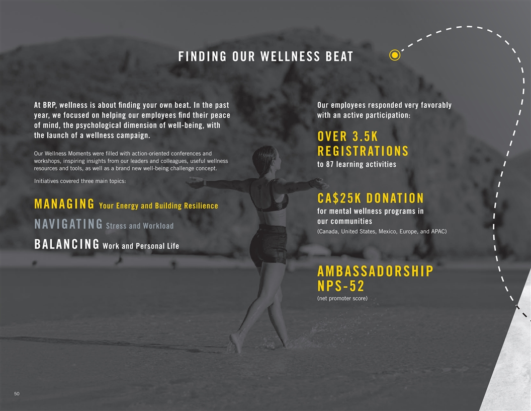 在BRP找到我们的健康节拍,健康就是找到自己的节拍。在过去我们的员工反应非常积极的一年里,我们专注于帮助我们的员工以积极的参与找到他们的平静:心灵,幸福的心理维度,随着健康运动的发起。超过3.5k Our Wellness Moments充满了以行动为导向的会议和注册研讨会,激发了我们的领导者和同事的洞察力,有用的Wellness to 87学习活动资源和工具,以及全新的福利挑战概念。倡议涵盖三个主要主题:加利福尼亚州 2.5万美元捐款管理您的能量并为我们社区的心理健康项目建立韧性导航压力和工作量(加拿大、美国、墨西哥、欧洲和亚太地区)平衡工作和个人生活大使NPS-52(净推荐值)50