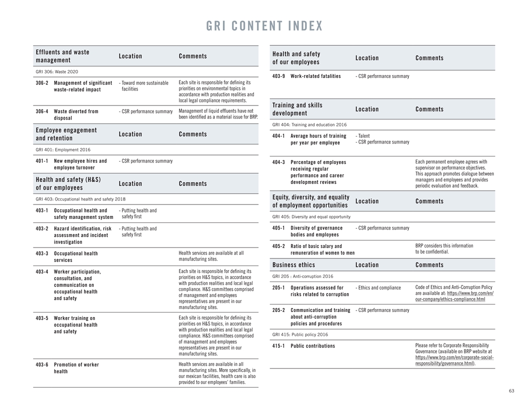 GRI内容指数污水和废物健康与安全位置评论位置评论我们员工的管理GRI 306:废物2020 403-9与工作相关的死亡-CSR绩效摘要每个站点负责根据生产现实和当地法律合规要求,定义其306-2对设施废物相关影响中环境主题的重大-T oward更可持续优先事项的管理。培训和技能地点评论液体流出物的管理尚未306-4废物转移-CSR绩效总结开发被确定为BRP的实质性问题。处置GRI 404:培训和教育2016年员工敬业度地点评论404-1平均培训小时数-人才和保留-每位员工每年的CSR绩效总结GRI 401:就业2016年401-1新员工聘用和-CSR绩效总结每位固定员工同意404-3员工离职主管对绩效目标的百分比。定期接收这种方法促进绩效和职业经理与员工之间的对话并提供健康与安全(H & S)发展评论地点评论定期评估和反馈。我们员工的公平、多样性、平等GRI 403:职业健康与安全2018地点就业机会评论403-1职业健康与-将健康与安全放在首位GRI 405:多样性和平等机会安全管理体系405-1治理的多样性-CSR绩效总结403-2危险识别、风险-将健康与安全放在首位的主体和员工评估及事件调查BRP认为这些信息405-2基本工资的比例,需保密。向男性提供妇女一切报酬的健康服务403-3职业健康制造站点。服务商业道德地点评论403-4工人参与,每个站点负责定义其GRI 205:反腐败2016年关于H & S主题的优先事项,按照协商,并根据生产现实和当地法律沟通对205-1操作进行评估-道德和合规Code of Ethics和反腐败政策合规。由职业健康组成的H & S委员会可在以下网址查阅:https://www.brp.com/en/risks related to corruption of management and employees and safety our-company/ethics-compliance.html代表在我们的生产现场。205-2沟通和培训-关于反腐败的CSR绩效总结每个站点负责根据政策和程序,根据职业健康与生产实际以及当地法律和安全GRI 415:公共政策2016年合规性,就H & S主题的优先事项确定其403-5工人培训。由管理层和员工组成的H & S委员会请参阅Corporate Responsibility 415-1 Public contribution representatives are present in our Governance(可在BRP网站的制造站点上查阅。https://www.brp.com/en/corporate-social-responsibility/governance.html)。所有403-6促进工人生产场所均提供健康服务。更具体地说,在健康我们的墨西哥设施,医疗保健也提供给我们的员工的家庭。63