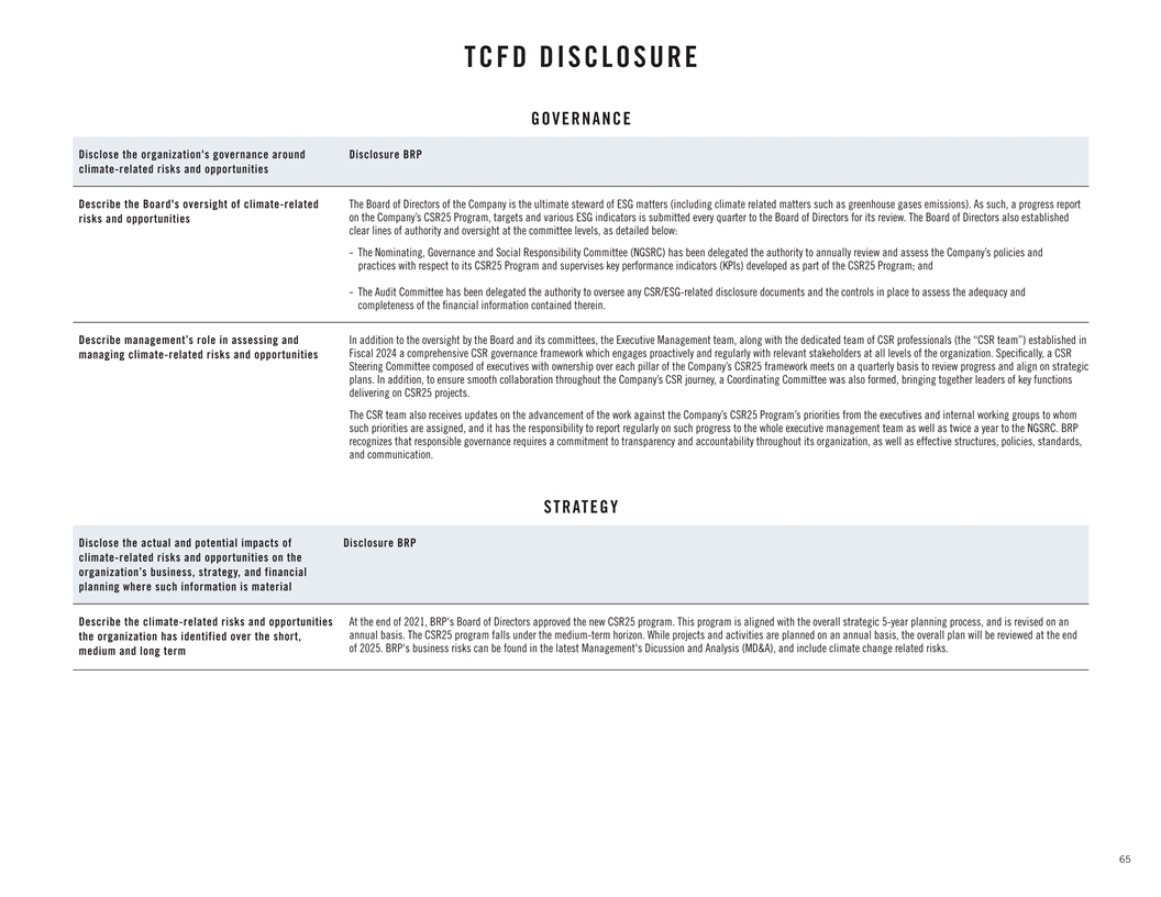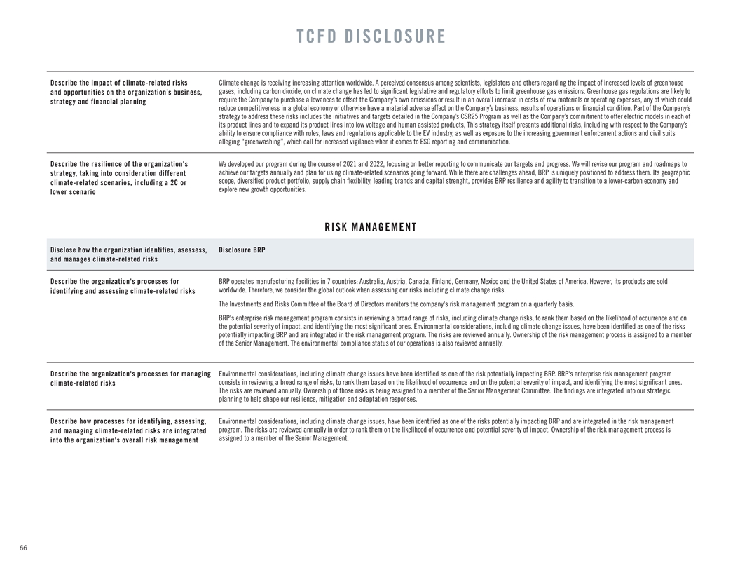 TCFD披露治理披露组织围绕披露BRP气候相关风险和机会的治理描述董事会对气候相关的监督公司董事会是ESG事项(包括温室气体排放等气候相关事项)的最终管家。因此,每季度向董事会提交一份关于公司CSR25计划、目标和各种ESG指标的进展报告,供其审查。董事会还在委员会层面建立了风险和机遇明确的权力和监督界限,详情如下:-提名、治理和社会责任委员会(NGSRC)已被授权每年审查和评估公司与CSR25计划相关的政策和做法,并监督作为CSR25计划一部分制定的关键绩效指标(KPI);-审计委员会已被授权监督任何CSR/ESG相关披露文件以及为评估其中所载财务信息的充分性和完整性而实施的控制措施。描述管理层在评估方面的作用,除了董事会及其委员会的监督外,执行管理团队,以及CSR专业人员专门团队(“CSR团队”)在2024财年建立了一个全面的CSR治理框架,该框架与组织各级的相关利益相关者进行主动和定期接触。具体而言,由对公司CSR25框架的每个支柱拥有所有权的高管组成的CSR管理气候相关风险和机遇指导委员会每季度举行一次会议,审查进展情况并就战略计划达成一致。此外,为确保公司CSR整个旅程的顺利协作,还组建了一个协调委员会,将交付CSR25项目的关键职能的领导者聚集在一起。CSR团队还从被分配此类优先事项的高管和内部工作组那里收到有关对照公司CSR25计划优先事项推进工作的最新信息,并有责任定期向整个执行管理团队以及每年两次向NGSRC报告此类进展情况。BRP认识到,负责任的治理要求对整个组织的透明度和问责制以及有效的结构、政策、标准和沟通作出承诺。Strategy披露披露BRP气候相关风险和机会对组织的业务、战略和财务规划的实际和潜在影响在此类信息重要的情况下描述气候相关风险和机会2021年底,BRP董事会批准了新的CSR25计划。该方案与整体战略5年规划进程保持一致,每年进行修订。CSR25计划属于中期视野。虽然项目和活动是按年度规划的,但总体计划将在组织确定的2025年短期结束时进行审查。BRP的业务风险可以在最新的Management的Dicussion and Analysis(MD & A)中找到,其中包括与气候变化相关的风险。中长期65