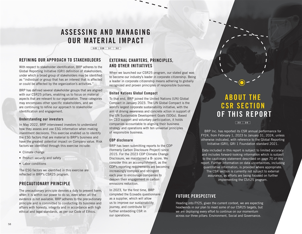 评估和管理我们的重大影响2-23 2-26 3-1 3-2完善我们对利益相关者外部章程、原则和其他有关利益相关者识别举措的方法,BRP遵守全球报告倡议组织(GRI)对利益相关者的定义,当我们启动CSR25计划时,我们既定的目标是,根据该计划,可能会确定一大群利益相关者,成为我们行业在企业公民方面的领导者。作为“有利益受到影响的个人或群体成为企业公民的领导者,意味着在全球范围内坚持或可能受到组织活动的影响。”公认且经过验证的负责任商业原则。BRP定义了几个使《联合国全球契约》与我们的CSR25支柱保持一致的利益相关者团体,使我们能够专注于与我们的组织相关的实质性方面。为此,BRP加入了联合国(UN)全球约可能包括其他特定利益相关者,我们于2023年1月达成契约。联合国全球契约是正在持续完善我们对利益相关者的方法世界上最大的企业可持续发展倡议,具有CSR部门的识别和参与。旨在推动支持联合国可持续发展目标(SDGs)的意识和具体行动。基于这份报告了解我们的投资者关于CEO支持和自愿参与的情况,它要求2-3 2-5家公司对调整其业务负责2022年5月,BRP采访了投资者,以十项普遍原则了解战略和运营,他们如何评估和使用ESG信息,并为负责任的企业报告了其CSR年度业绩投资决策。这项工作使我们能够确定从2023年2月1日到2024年1月31日的24财年,除非对BRP的业务具有重大意义且另有说明的ESG因素,否则参照全球报告的CDP披露对公司价值具有最大的潜在影响。Risk Initiative(GRI),GRI 1 Foundation标准2021。我们通过本次练习确定的因素包括:BRP一直在向CDP(前身为碳披露项目)提交报告,因为本报告中包含的数据受限于有限的准确性•气候变化2015。对于受制于•产品安全性和安全披露的2023年CDP气候变化并包含前瞻性信息,我们维持B-评分。我们对本报告第70页描述的警示性声明认为这是一项成就,正如报告所述。酌情提供有关数据不确定性的更多信息,包括•劳动条件CDP的报告要求正在变为量化信息。我们在这次演习中确定的ESG因素越来越复杂和严格CSR部分目前不受外部反映在BRP的CSR25计划中。每年都会鼓励公司保证,因为正在集中努力进一步深化其参与实施CSR25计划的碳减排。预防预防原则2023年第一次,BRP预防原则表示一种预防伤害的义务,在我们力所能及的情况下完成了Ecovadis问卷调查,即使在作为供应商的所有未来视角下,这将允许证据不可得。BRP坚持谨慎的我们以提高我们的可持续发展进入25财年,鉴于当前的背景,我们期待原则并致力于开展其业务和旅程,并在我们实现某些CSR25目标的计划中为逆风做出贡献,但是以诚实、诚信和按照高度进一步嵌入CSR的方式处理事务,我们正在根据我们的道德准则部署一切努力,以继续我们势头强劲的道德和法律标准。我们的运营跨越我们的三大支柱:环境、社会和治理。58