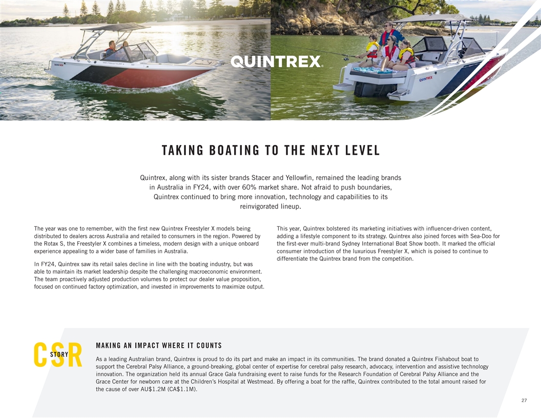 将Boating带到下一个级别Quintrex与其姊妹品牌Stacer和YellowFin在24财年仍然是澳大利亚的领先品牌,市场份额超过60%。不惧突破边界,Quintrex继续为其重振阵容带来更多创新、技术和能力。这一年值得铭记,今年首批新款Quintrex Freestyler X车型上市,Quintrex以网红驱动的内容支持其营销举措,分发给澳大利亚各地的经销商,并零售给该地区的消费者。通过在其战略中添加生活方式组件提供支持。Quintrex还与Sea-Doo联手推出了Rotax S,Freestyler X将永恒、现代的设计与首个多品牌悉尼国际船展展台上的独特之处结合在一起。这标志着吸引澳大利亚更广泛家庭基础的官方体验。消费者介绍了豪华的Freestyler X,这有望继续使Quintrex品牌在竞争中脱颖而出。24财年,Quintrex的零售额与划船行业同步下滑,但在宏观经济环境充满挑战的情况下仍能保持市场领先地位。团队主动调整产量以保护我们的经销商价值主张,专注于持续的工厂优化,并投资于改进以实现产量最大化。作为澳大利亚领先品牌,Quintrex在将故事视为历史的地方产生了影响,它很自豪能够尽自己的一份力量并在其社区产生影响。该品牌向CSR捐赠了一艘Quintrex Fishabout船,以支持脑瘫联盟,这是一个开创性的、全球性的脑瘫研究、倡导、干预和辅助技术创新专业知识中心。该组织举行了一年一度的Grace Gala筹款活动,为西米德儿童医院的脑瘫联盟研究基金会和Grace新生儿护理中心筹集资金。通过为抽奖活动提供一艘船,Quintrex为该事业筹集的总金额贡献了超过120万澳元(加利福尼亚州 110万美元)。27