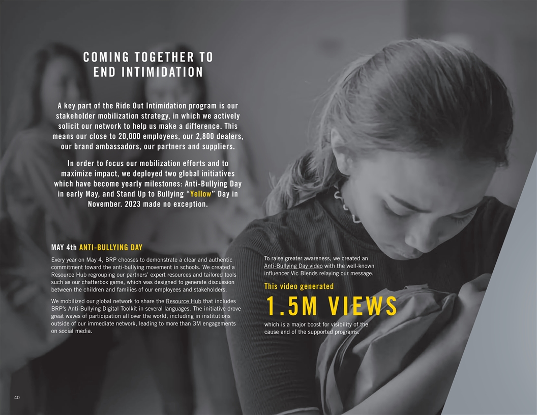 走到一起结束恐吓Ride Out恐吓计划的一个关键部分是我们的利益相关者动员战略,其中我们积极征求我们的网络,以帮助我们有所作为。这意味着我们接近20000名员工,我们2800名经销商,我们的品牌大使,我们的合作伙伴和供应商。为了集中动员力量,最大限度地发挥影响,我们部署了两项已成为年度里程碑的全球倡议:5月初的反欺凌日,以及11月的挺起霸凌“黄”日。2023年也不例外。5月4日反欺凌日为了提高更多的认识,我们创建了一个每年5月4日,BRP选择用大家熟知的致力于学校反欺凌运动的方式,展示一个清晰、真实的反欺凌日视频。我们创建了一个有影响力的人Vic Blends,传达我们的信息。Resource Hub重新组合了我们合作伙伴的专家资源和量身定制的工具,例如我们的话匣游戏,该游戏旨在引发讨论这段视频在我们员工和利益相关者的孩子和家庭之间生成。我们调动了我们的全球网络来共享资源中心,其中包含几种语言的BRP反欺凌数字工具包。该倡议在世界各地引发了150万次VIEWS的巨大参与浪潮,包括在我们即时网络之外的机构中,导致了超过3M的参与,这是对on社交媒体的可见度和所支持的计划的重大推动。40