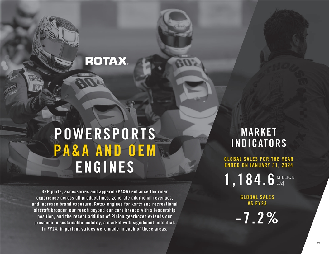 截至2024年1月31日止年度的市场动力指标PA & A和OEM全球销售与FY23相比,发动机百万级1,184.6 加利福尼亚州 $ BRP零件、配件和服装(PA & A)增强了骑手在所有产品线的全球销售体验,产生了额外收入,并增加了品牌曝光率。用于卡丁车和休闲飞机的Rotax发动机以领先地位将我们的影响力扩大到核心品牌之外,最近新增的小齿轮变速箱扩大了我们在可持续移动领域-7.2 %的影响力,这是一个具有巨大潜力的市场。在24财年,这些领域中的每一个领域都取得了重要进展。21
