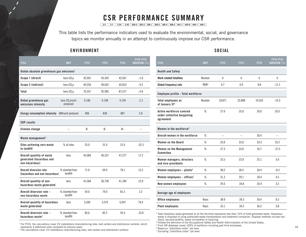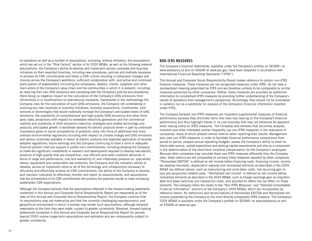 运营以及多项假设,包括但不限于其2024年MD & A“风险因素”部分中列出的假设非国际财务报告准则措施,以及以下材料公司财务报表,可在SEDAR +上的公司简介中按假设获得:公司开发和实施各种企业和业务的能力www.sedarplus.ca和EDGAR上的www.sec.gov,是根据其预期时间表的举措编制的,包括新程序,必要的政策和方法国际财务报告准则(“IFRS”)。以实现其CSR承诺并培养CSR文化,从而导致公司员工的行为变化和选择;与公司充分协作、积极和持续本年度和企业社会责任报告提及利益相关者(包括员工、经销商、客户、供应商和其他财务措施)的某些非国际财务报告准则参与。这些措施不是国际财务报告准则下公认的措施,没有公司价值链的主要参与者及其所在社区),包括国际财务报告准则规定的标准化含义,因此不太可能通过减少自身的GHG排放并遵守公司的政策和程序与类似措施进行比较;其他公司提出的措施。相反,这些措施是作为补充国际财务报告准则措施的信息提供的,这些信息对公司的GHG排放量的计算没有负面影响,方法是从管理层的角度进一步了解公司对国际标准、框架或方法的改进或修改的运营结果。因此,它们不应被视为公司用于计算此类GHG排放量;公司不承担或孤立地或替代分析所报告的公司财务信息,以追求任何新的公司或业务举措、业务收购、投资,根据IFRS联合开展的风险投资或技术可大幅增加公司预期的GHG水平公司认为,非国际财务报告准则措施是财务排放的重要补充措施;是否有全面和高质量的GHG排放和其他第三项绩效,因为它们消除了对公司财务方数据影响较小的项目;对可再生能源发电和商业业绩的预测,从而突出其核心业务的趋势,否则这些趋势可能不会是明显的↓温室气体GHG减排战略和相关技术的可行性和可扩展性,并且在完全依赖IFRS措施时。该公司还认为,证券分析师、产品;全球电动产品需求的预期增长部分是由持续的投资者和其他感兴趣的各方推动的,在评估产品的社会可接受性、更多和更多公司的生效的重要性时,经常使用非国际财务报告准则衡量标准,其中许多公司在报告其结果时提供了类似的衡量标准。管理层繁重的环境法规,包括与气候变化和GHG排放有关的法规,也使用了非国际财务报告准则措施,以便便于进行财务业绩比较以及有利于电动产品的各种激励措施以及最近几个时期的预期应用,编制年度经营预算,评估公司满足其所采用法规的能力;未来收益以及公司继续拥有稳健或充足的未来偿债能力、资本支出和营运资金需求,以及作为能够支持或证明此类承诺的组成部分财务状况,包括允许公司确定公司员工的短期激励薪酬。对开发新电动汽车所需的研发进行重大投资由于其他公司对这些非国际财务报告准则衡量标准的计算可能与公司在does中具有竞争力、成本效益和满足客户需求的高质量产品不同,因此这些衡量标准无法与其他公司报告的类似标题的衡量标准进行比较。范围和绩效方面;专门的“正常化EBITDA”的成本和可用性以及通胀压力被定义为扣除融资成本、融资收入、收入劳动、设备和可持续原材料;公司和行业对2024年所述的费用(回收)、折旧费用和正常化要素征税的能力开发、获取或实施部分或全部MD & A(定义见上文)所需的技术和基础设施,例如重组和清盘成本, 非经常性收益或高效有效地实现其CSR承诺;公司开发亏损和收购相关成本的能力。“正常化净收入”定义为之前的净收入,并维持指标以有效监测和报告其进展;以及2024年MD & A中描述的假设正常化要素,例如长期外汇收益,即其CSR承诺的实现将产生预期结果或满足不断增加的债务和租赁负债以及交易成本,并进行调整以反映对这些利益相关者CSR预期的税收影响。要素。公司请读者参考公司2024年MD & A中的“非国际财务报告准则措施”和“选定的合并尽管公司认为前瞻性陈述财务信息中反映的假设”部分,这些部分包含在本年度和企业社会责任报告中,截至本文引用时是合理的,对于本年度和企业社会责任报告的标准化EBITDA和标准化净日的定义和调节,公司告诫说,公司按照最直接可比的国际财务报告准则措施呈列的收入。该公司的假设可能无法实现,目前具有挑战性的宏观经济和2024年MD & A可在www.sedarplus.ca上的SEDAR +和其演变所处的地缘政治环境的公司简介中获得,这可能会产生此类假设,尽管在www.sec.gov上的EDGAR上认为这些假设在作出时是合理的,但存在更大的不确定性。此外,本年度和企业社会责任报告中包含的2024年以后期间的前瞻性陈述涉及较长期的假设和估计,因此受到更大的不确定性影响。72