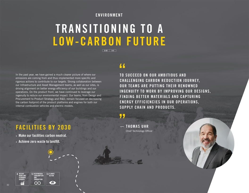 环境向低碳未来过渡2-22 3-3在过去的一年里,我们已经更清楚地了解了我们在雄心勃勃的目标和排放方面取得成功的地方,从而实施了更具体和更具挑战性的减碳之旅,采取了更严格的行动来为我们的目标做出贡献。我们的基础设施和资产管理团队以及我们的站点之间的强大协作,是我们的团队正在通过改进我们的设计和运营,将他们著名的驱动对齐放在我们建筑物的更好能源效率和我们的工作才干上。在产品方面,我们继续发挥我们的独创性,以减少对环境的影响。我们的团队,从设计和寻找更好的材料和捕捉采购到产品战略和研发,仍然专注于减少产品平台和发动机的碳足迹,以实现我们在运营、内燃机汽车和电动车型中的能源效率。供应链和产品。-THOMAS UHR设施2030年前首席技术官•使我们的设施实现碳中和。•实现垃圾零填埋。体面负责的气候81213工作和消费行动经济和增长生产32