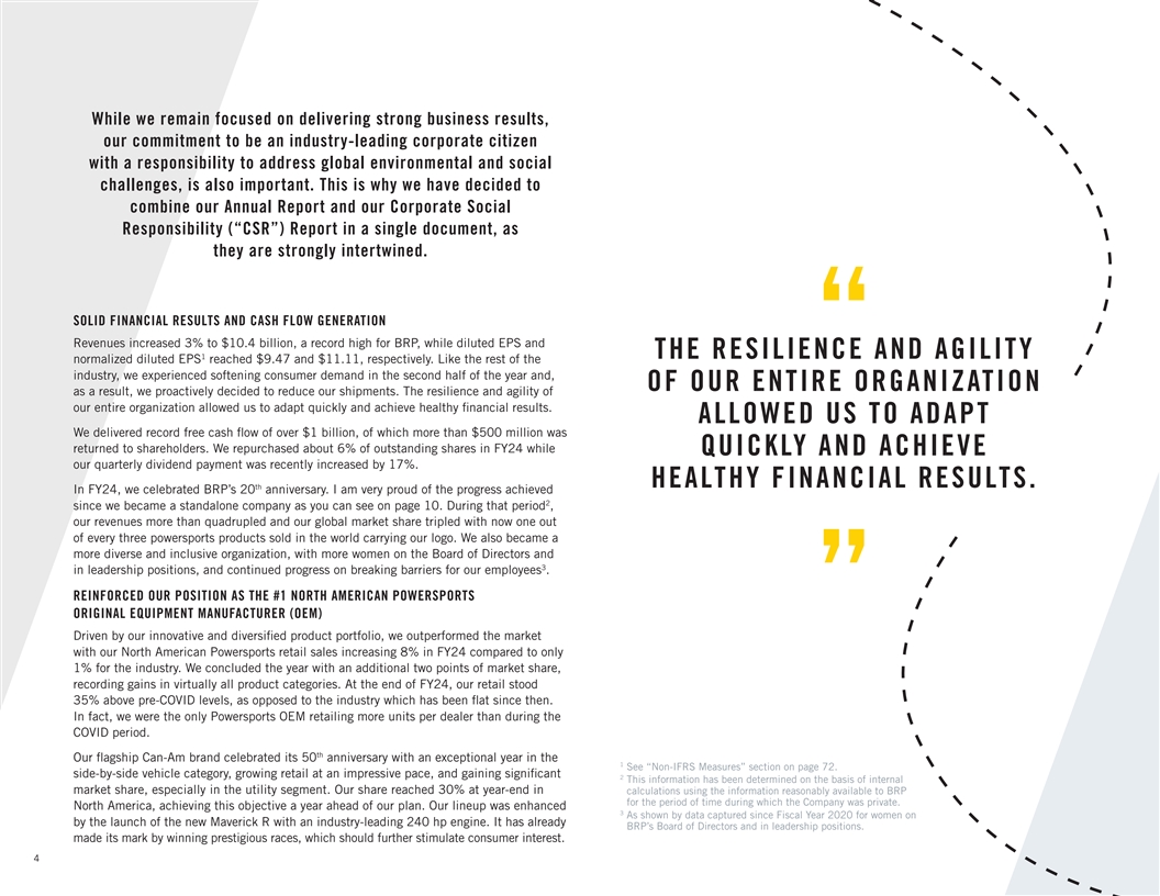 虽然我们仍然专注于提供强劲的业务成果,但我们承诺成为行业领先的企业公民,有责任应对全球环境和社会挑战,这一点也很重要。这就是为什么我们决定将我们的年度报告和我们的企业社会责任(“CSR”)报告合并在一个文件中,因为它们是强烈交织在一起的。稳健的财务业绩和产生现金流的收入增长3%至104亿美元,创BRP历史新高,而摊薄后每股收益以及Resilience和AGILITY 1正常化摊薄后每股收益分别达到9.47美元和11.11美元。与行业其他成员一样,我们在下半年经历了消费者需求的疲软,因此,我们整个组织都主动决定减少出货量。我们整个组织的韧性和敏捷性使我们能够迅速适应并取得健康的财务业绩。允许我们进行调整我们交付了创纪录的超过10亿美元的自由现金流,其中超过5亿美元返还给了股东。我们在24财年回购了约6%的流通股,同时迅速实现了我们的季度股息支付,最近增加了17%。健康的财务业绩。在24财年,我们庆祝了BRP成立20周年。正如你在第10页看到的那样,自从我们成为一家独立公司以来,我为2所取得的进展感到非常自豪。在此期间,我们的收入增长了四倍多,我们的全球市场份额增长了两倍,现在全球售出的每三款动力运动产品中就有一款带有我们的标志。我们还成为一个更加多元化和包容性更强的组织,董事会中有更多的女性,3名女性担任领导职务,并在为员工打破障碍方面继续取得进展。在我们创新和多样化的产品组合的推动下,巩固了我们作为# 1北美动力运动原始设备制造商(OEM)的地位,我们的表现优于市场,我们的北美动力运动零售销售额在24财年增长了8%,而该行业仅为1%。我们以额外两个点的市场份额结束了这一年,在几乎所有产品类别中都录得了增长。在24财年末,我们的零售比新冠疫情前的水平高出35%,而自那以来该行业一直持平。事实上,我们是唯一一家Powersports主机厂,每个经销商的零售数量超过了新冠疫情期间。我们的旗舰Can-AM品牌在第72页的1见“非国际财务报告准则措施”部分以非凡的一年庆祝了其成立50周年。并排车辆类别,零售增长速度令人印象深刻,并获得了显着2这一信息是根据内部市场份额确定的,尤其是在公用事业领域。我们的份额在年底时达到了30%,这是使用公司私有化期间BRP合理获得的信息进行计算得出的。北美,比我们的计划提前一年实现这一目标。我们的阵容得到了加强3,正如自2020财年以来通过推出配备行业领先的240马力发动机的新款Maverick R为女性拍摄的数据所显示的那样。它已经成为BRP的董事会成员并担任领导职务。通过赢得久负盛名的比赛而崭露头角,这应该会进一步激发消费者的兴趣。4