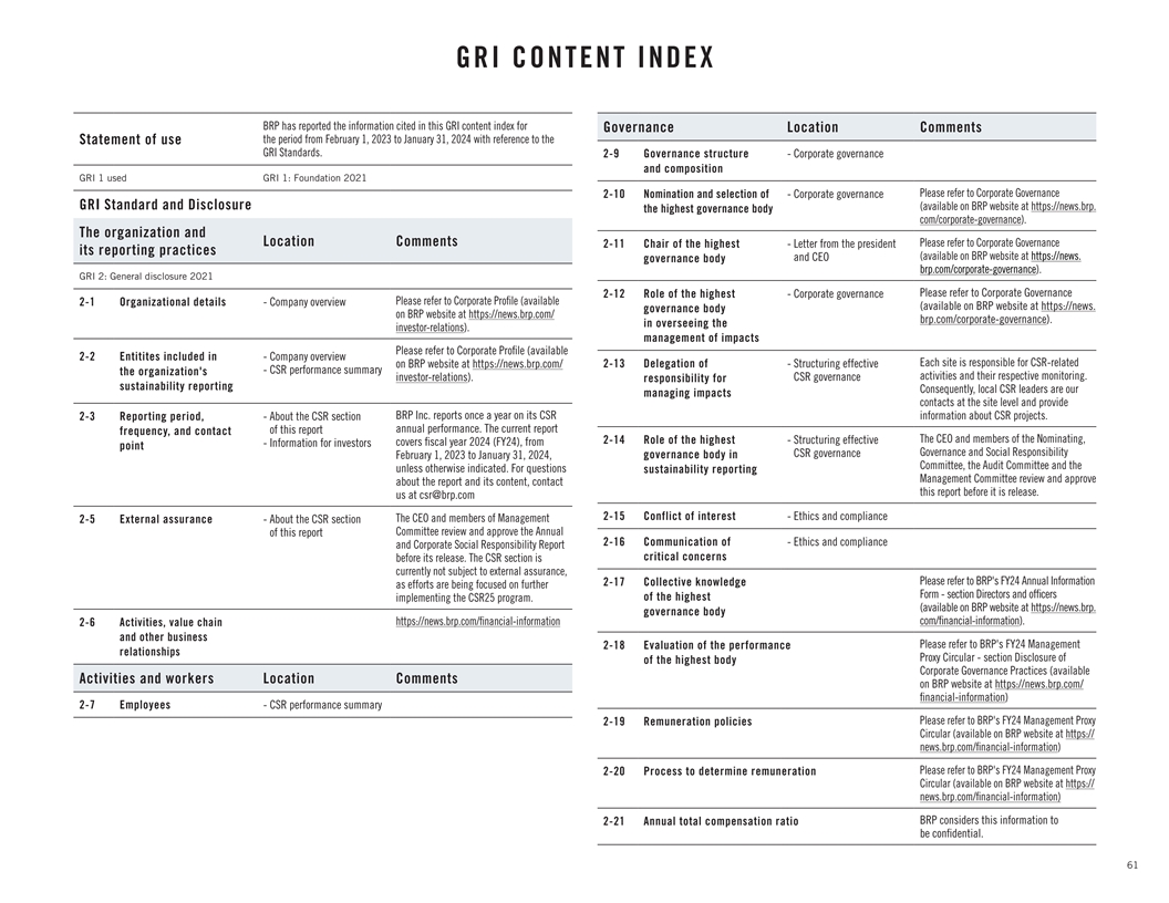 GRI内容指数BRP已报告此GRI内容指数中引用的信息,用于治理位置评论2023年2月1日至2024年1月31日期间的使用GRI标准声明。2-9治理结构-公司治理和组成GRI 1使用了GRI 1:Foundation 2021 2-10提名和遴选-公司治理请参阅公司治理GRI标准和披露(可在BRP网站https://news.brp.最高治理机构com/corporate-governance上查阅)。组织机构和地点评论请参阅公司治理2-11最高主席-总裁的信其报告做法(可在BRP网站https://news.和首席执行官治理机构brp.com/corporate-governance上查阅)。GRI 2:一般披露2021请参阅公司治理2-12最高角色-公司治理请参阅公司简介(可查阅2-1组织详情-公司概览(可在BRP网站https://news上查阅。在监督投资者关系方面,治理机构可在BRP网站https://news.brp.com/brp.com/corporate-governance上查阅)。影响的管理请参阅公司简介(可查阅2-2包括在-公司概览中的实体每个站点负责CSR相关的2-13授权-结构在BRP网站https://news.brp.com/上有效-CSR绩效总结组织的活动及其各自的监测。CSR治理投资者-关系)。可持续发展报告的责任因此,当地的CSR负责人是我们在现场级别管理影响联系人,并每年提供一次关于其CSR项目的CSR信息的BRP Inc.报告。2-3报告期,-关于CSR版块年度业绩。本报告当前报告频率,并联系首席执行官和提名成员,2-14角色最高-结构有效涵盖2024财年(FY24),从-信息投资者点治理和社会责任CSR治理2023年2月1日至2024年1月31日,治理机构在委员会、审计委员会和除非另有说明。有关可持续发展报告管理委员会审查和批准有关报告及其内容的问题,请在报告发布前与本报告联系。我们在csr@brp.com 2-15利益冲突-道德和合规CEO和管理层成员2-5外部保证-关于CSR部门委员会审查和批准本报告的年度2-16沟通-道德和合规以及企业社会责任报告发布前的关键关注事项。CSR部分目前不接受外部保证,2-17集体知识请参阅BRP的FY24年度信息,因为工作重点是进一步实施CSR25计划的最高层的表格部门董事和高级职员。(可在BRP网站https://news.brp.治理机构https://news.brp.com/financial-information com/financial-information查阅)。2-6项活动,价值链及其他业务请参阅BRP FY24管理层2-18评估业绩关系代理通函-披露最高机构企业管治实务(可用活动和工人所处位置评论丨BRP网站https://news.brp.com/financial-information)2-7员工-CSR绩效摘要请参阅BRP的FY24管理层代理2-19薪酬政策通告(可在BRP网站https://news.brp.com/financial-information查阅)请参阅BRP的FY24管理层代理2-20流程确定薪酬通告(可在BRP网站https://news.brp.com/financial-information查阅)2-21年度总薪酬比率BRP认为此信息属机密。61