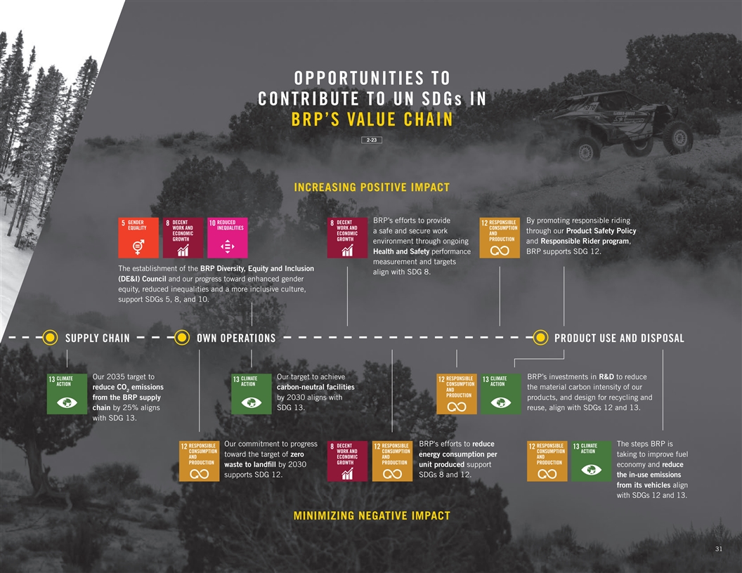 在BRP价值链中为联合国可持续发展目标做出贡献的机会2-23不断增加的积极影响BRP努力通过促进负责任的骑行性别正派减少了体面的责任5810812平等工作和不平等工作和消费通过我们的产品安全政策提供安全可靠的工作经济经济和增长生产环境通过持续和负责任的骑手计划,健康和安全绩效丨BRP支持SDG 12.衡量和目标建立丨BRP BRP多样性、公平(DEE & I)理事会和我们在加强性别平等、减少不平等和更具包容性的文化方面取得的进展,支持可持续发展目标5、8和10。供应链自己的运营产品的使用和处置我们的2035年目标到我们的目标实现BRP对研发的投资以减少对气候负责的气候13131213行动行动消费行动减少CO排放碳中和设施到2030年,我们和2从BRP供应中生产的材料碳强度与产品保持一致,可循环使用和上链的设计增加25%与SDG 13保持一致,再利用,与SDGs 12和13保持一致。与SDG 13保持一致。我们对进步的承诺BRP努力减少步骤BRP负责体面负责负责任的气候128121213消费工作和消费消费行动朝着每次摄入能源消耗为零的目标提高燃料和经济以及到2030年生产增长生产产生的废物到填埋的单位产生的支持经济性和减少支持SDG 12。可持续发展目标8和12.其车辆的在用排放与可持续发展目标12和13保持一致。尽量减少负面影响31