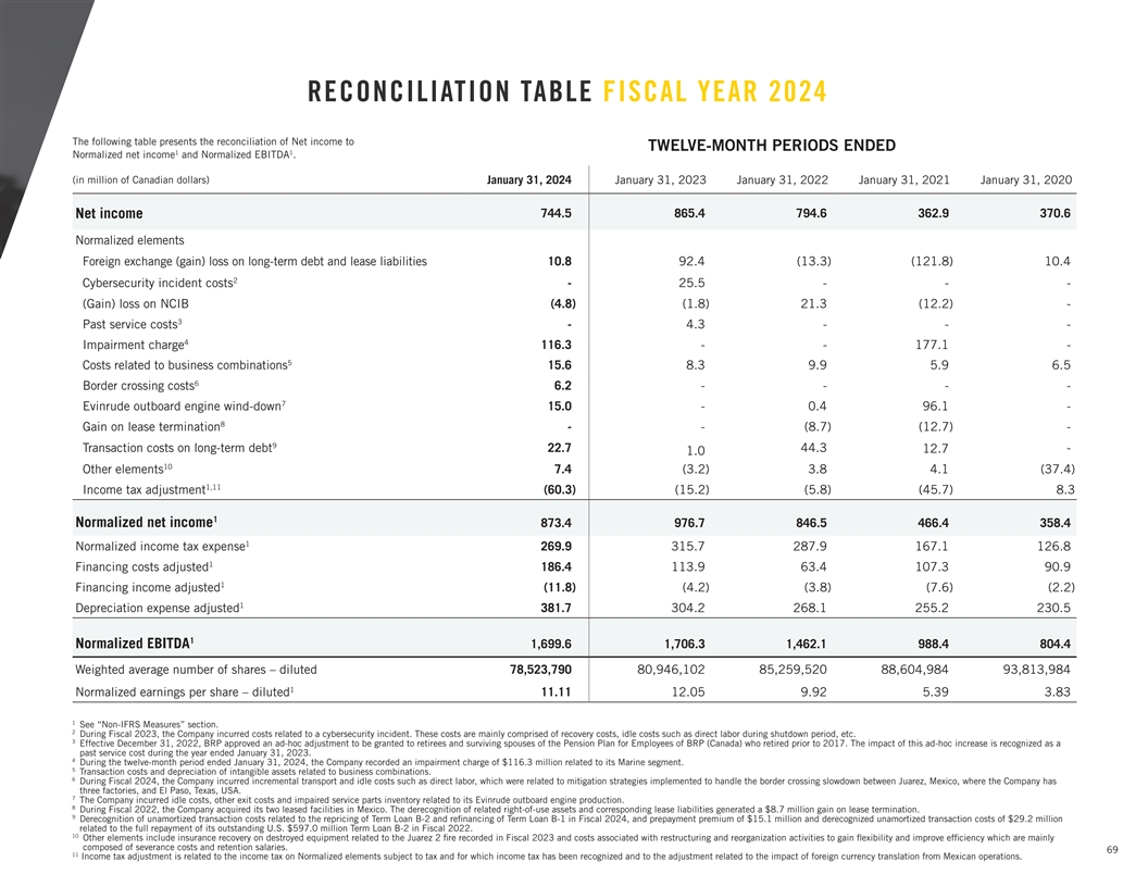 调节表2024财年下表列出净收入与截至11的十二个月期间正常化净收入和正常化EBITDA的调节情况。(百万加元)2024年1月31日2023年1月31日2022年1月31日2021年1月31日,2020744.58 65.47 94.6362.93 70.6净收益常态化要素长期债务汇兑(收益)损失和租赁负债10.89 2.4(13.3)(121.8)10.42网络安全事件成本-25.5---(收益)NCIB损失(4.8)(1.8)21.3(12.2)-3过去服务成本-4.3---4减值费用116.3--177.1-5与企业合并相关的成本15.68.39.95.9 6.56过境成本6.2----7 Evinrude舷外机停机15.0-0.496.1-8终止租赁收益--(8.7)(12.7)-9长期债务的交易成本22.74 4.3-12.7 1.0财务10其他要素7.4(3.2)3.84.1(37.4)1,11所得税调整(60.3)(15.2)(5.8)(45.7)8.31归一化净收入873.49 76.7846.5466.4358.41归一化所得税费用269.93 15.72 87.9 167.11 26.81融资成本调整后186.41 13.96 3.4 107.39 0.91调整后融资收益(11.8)(4.2)(3.8)(7.6)(2.2)1折旧费用调整后381.73 04.2268.1255.22 30.51归一化EBITDA 1,699.61,706.31,462.1988.4804.4加权平均股数–稀释后78,523,79080,946,10285,259,52088,604,98493,813,9841归一化每股收益–稀释后11.11 12.05 9.9 25.39 3.83 1见“2在2023财年,公司发生了与网络安全事件相关的费用。这些成本主要包括回收y成本、停工期间的直接人工等闲置成本。3自2022年12月31日起,BRP批准了一项特设调整,授予在2017年之前退休的BRP(加拿大)雇员养老金计划的退休人员和未亡配偶。该临时增加的影响于截至2023年1月31日止年度确认为过往服务成本。4在截至2024年1月31日的十二个月期间,公司记录了与IT海事部门相关的1.163亿美元的减值费用。与企业合并相关的5T赎回成本和无形资产折旧。6在2024财年,公司产生了直接人工等增量运输和闲置成本,这与为应对公司拥有三家工厂的墨西哥华雷斯与美国德克萨斯州埃尔帕索之间的边境过境放缓而实施的缓解战略有关。7该公司产生了与其Evinrude舷外机生产相关的闲置成本、其他退出成本和受损的服务零部件库存。8在2022财年,公司收购了其在墨西哥的两个租赁设施。终止确认相关使用权资产和相应的租赁负债产生了870万美元的租赁终止收益。9终止确认与2024财年定期贷款B-2的重新定价和定期贷款B-1的再融资相关的未摊销交易成本,以及与2022财年全额偿还其未偿还的5.97亿美元定期贷款B-2相关的1510万美元的预付款溢价和2920万美元的终止确认的未摊销交易成本。10其他要素包括2023财年记录的与Juarez 2火灾相关的被毁设备的保险追偿,以及与重组和重组活动相关的获得灵活性和提高效率的成本,这些成本主要由遣散费和留用工资组成。6911所得税调整涉及须缴税且已确认所得税的正常化要素的所得税,以及与墨西哥业务的外币换算影响相关的调整。