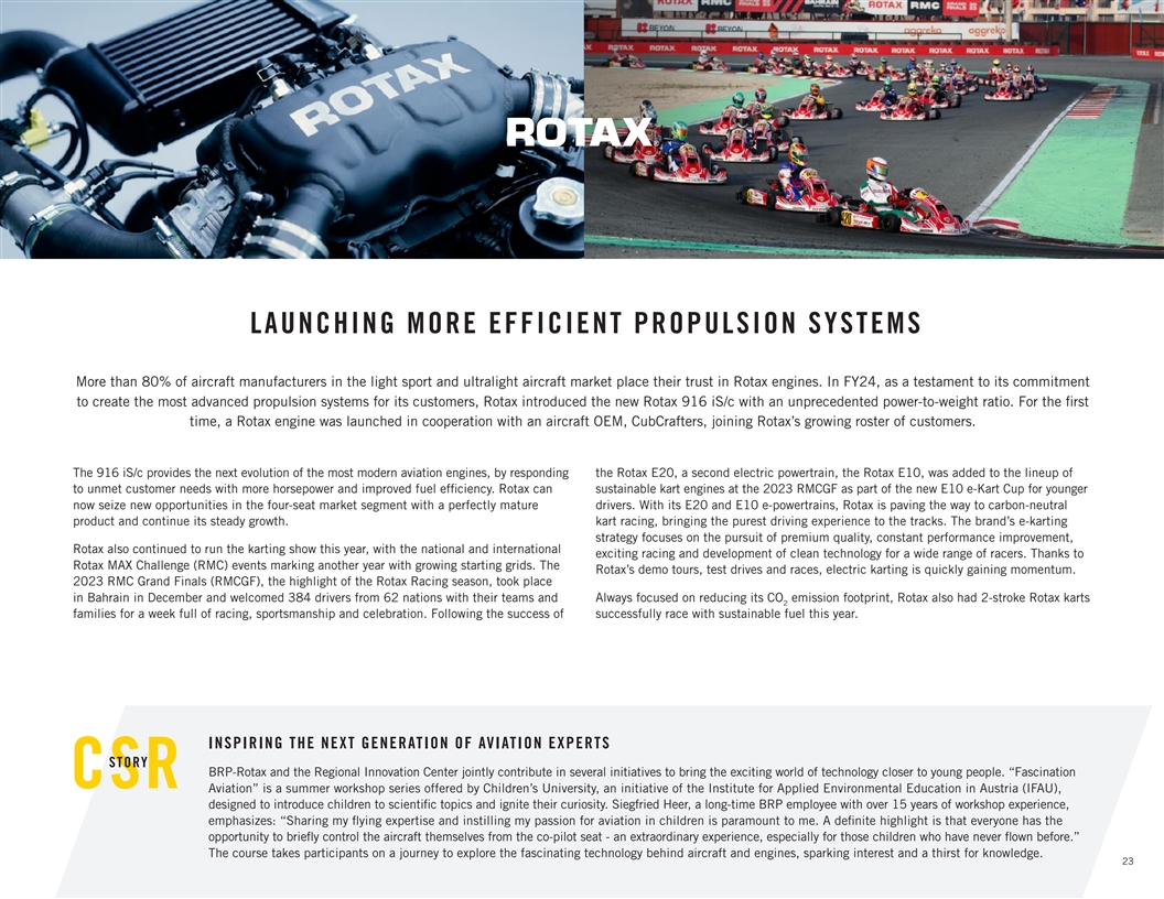 推出更高效的推进系统轻型运动和超轻型飞机市场80%以上的飞机制造商对Rotax发动机给予信任。在24财年,为了证明其致力于为客户创造最先进的推进系统,Rotax推出了全新的Rotax 916 iS/c,其功率重量比前所未有。首次与飞机制造商CubCrafters合作推出了Rotax发动机,加入了Rotax不断增长的客户名单。916 iS/c提供了最现代化航空发动机的下一次进化,通过响应Rotax E20,第二个电动动力总成Rotax E10被添加到阵容中,以更大的马力和更高的燃油效率满足未满足的客户需求。Rotax can sustainable kart engines at the 2023 RMCGF as part of the new E10 e-Kart Cup for younger now seizes new opportunities in the four-seat market segment with a perfect mature driver。凭借E20和E10的e-powertrains,Rotax正在为碳中和产品铺平道路,并继续稳步增长。卡丁车赛车,为赛道带来最纯粹的驾驶体验。该品牌的e-karting战略注重追求优质品质,性能不断提升,Rotax也在今年继续运营卡丁车展,以国家和国际的精彩赛车和为广大赛车手开发清洁技术。感谢Rotax MAX Challenge(RMC)赛事,标志着又一年的起跑网格不断增长。Rotax的演示之旅、试驾和比赛,电动卡丁车正迅速蓄势待发。2023 RMC总决赛(RMCGF)是Rotax赛车赛季的重头戏,于12月在巴林举行,迎来了来自62个国家的384名车手和他们的车队,并且始终专注于减少其CO排放足迹,Rotax还拥有2冲程Rotax卡丁车2家族,为期一周,充满了赛车、体育精神和庆祝活动。继今年成功与可持续燃料赛跑之后。激励下一代航空专家故事BRP-Rotax和区域创新中心在多项举措中共同做出贡献,让激动人心的科技世界更接近年轻人。“Fascination CSR Aviation”是儿童大学提供的暑期工作坊系列,是奥地利应用环境教育研究所(IFAU)的一项倡议,旨在向孩子们介绍科学主题并点燃他们的好奇心。拥有超15年车间经验的长期BRP员工Siegfried Heer强调:“分享我的飞行专业知识,将我对航空的热情灌输给孩子们,对我来说至关重要。一个确定的亮点是,每个人都有机会从副驾驶座位上自己短暂地控制飞机——这是一种非凡的体验,尤其是对于那些从未坐过飞机的孩子们。”该课程将带领参与者踏上探索飞机和发动机背后迷人技术的旅程,引发兴趣和对知识的渴望。23