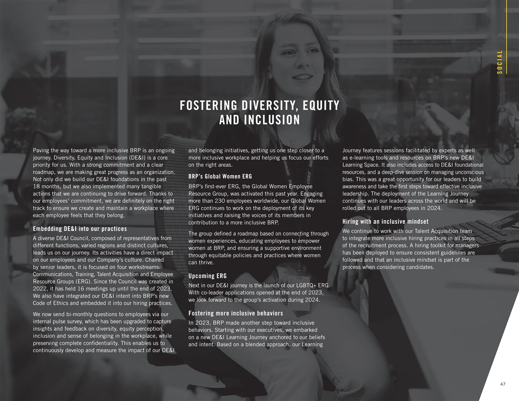 促进多样性、公平和包容性为迈向更具包容性的BRP铺平道路是一项持续不断的、归属感强的举措,它让我们离由专家以及旅程推动的Journey特色课程更近了一步。Diversity,Equity and Inclusion(DEE & I)是一个核心更具包容性的工作场所,它帮助我们将作为电子学习工具和资源的努力集中在BRP对我们来说新的DEE & I优先事项上。以坚定的承诺和对正确领域的明确。学习空间。它还包括访问DE & I基础路线图,我们作为一个组织正在取得巨大进展。资源,以及一个关于管理无意识BRP的全球女性ERG的深入会议我们不仅在过去的偏见中建立了我们的DE & I基础。对于我们的领导者来说,这是一个建立18个月的绝佳机会,但我们也实施了许多实实在在的BRP的首个ERG,即全球女性员工意识,并朝着我们正在继续推动的有效包容行动迈出了第一步。感谢Resource Group,在过去一年被激活。引领领导力。学习之旅的部署我们员工的承诺,我们绝对是对的全球230多名员工,我们的全球女性继续与我们在世界各地的领导者并将在轨道上确保我们创建和维护一个工作场所,在这个工作场所,ERG将继续致力于在2024年向所有BRP员工推出其密钥的部署。每个员工都感到自己属于自己。在以包容的心态进行招聘时采取主动行动,并提高其成员的声音,为更具包容性的BRP做出贡献。将DE & I嵌入我们的实践中我们继续与我们的人才获取团队合作该集团定义了一个基于通过多元化DE & I委员会进行连接的路线图,该委员会由来自将更具包容性的招聘实践融入女性经历的所有步骤的代表组成,教育员工赋予招聘过程的不同职能、不同地区和不同文化的权力。为BRP的女性经理人提供的招聘工具包,并确保一个支持性的环境带领我们踏上我们的旅程。其活动具有直接影响,已部署以确保一致的指导方针是通过公平的政策和实践,其中女性对我们的员工和我们公司的文化。主席紧随其后,包容的心态是能茁壮成长的一部分。由高级领导者,它专注于四个工作流程:考虑候选人时的流程。沟通、培训、人才获取和员工即将到来的ERG资源组(ERG)。由于理事会是在Next中创建的,在我们的DEE & I旅程中,是我们LGBTQ + ERG的启动。2022年,截至2023年底已召开16次会议。随着联合领导者申请于2023年底开放,我们还将我们的DEE & I意向整合到BRP的新的我们期待集团在2024年激活。Code of Ethics并将其嵌入我们的招聘实践中。培养更具包容性的行为方式我们现在通过我们的内部脉搏调查向员工发送双月问题,该调查已升级为捕捉2023年,BRP朝着对多样性、公平感、行为的包容性洞察和反馈又迈出了一步。从我们的高管开始,我们在工作场所开始了包容和归属感,同时踏上了新的DEE & I学习之旅,锚定在我们的信念上,保留了完全的保密性。这使我们能够和意图。基于混合方法,我们的学习不断发展和衡量我们的DEE & I 47 SOCIAL的影响