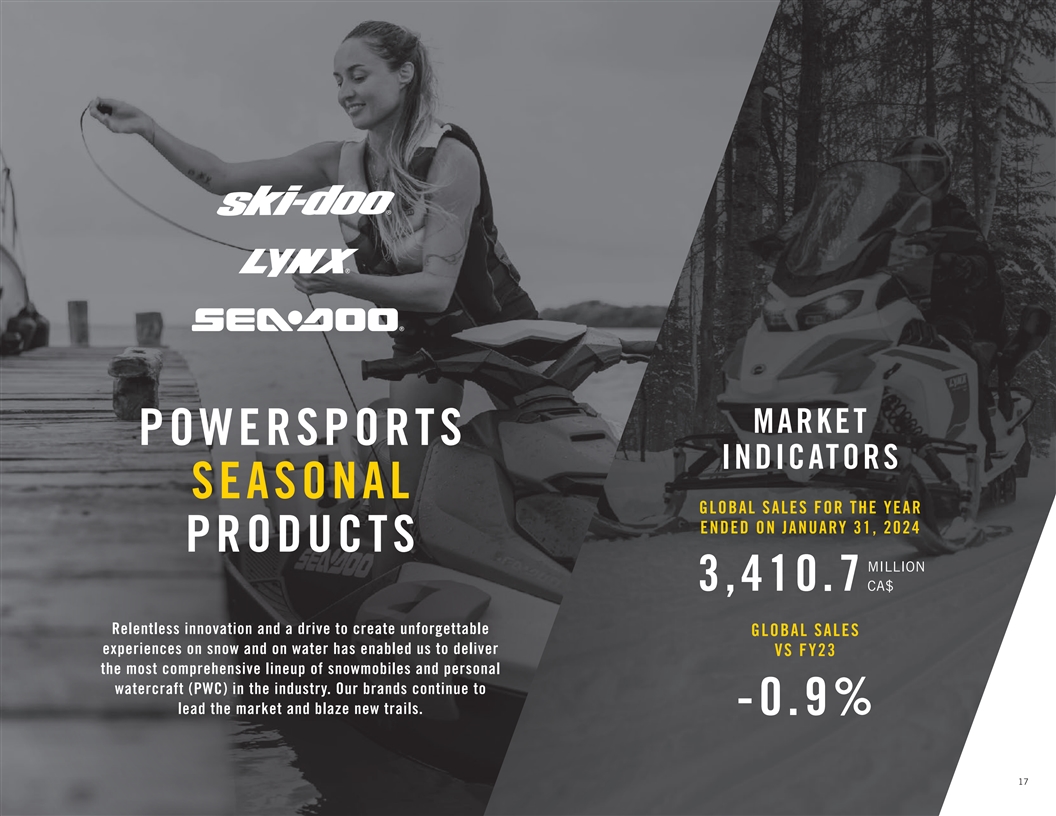 市场动力指标截至2024年1月31日止年度的季节性全球销售产生了数百万美元的收入3,410.7 加利福尼亚州美元不懈的创新以及在雪地和水上创造令人难忘的全球销售体验的动力,使我们能够提供与FY23相比业内最全面的雪地摩托和个人船只(PWC)产品阵容。我们的品牌继续引领市场,并开辟新的道路。-0.9% 17