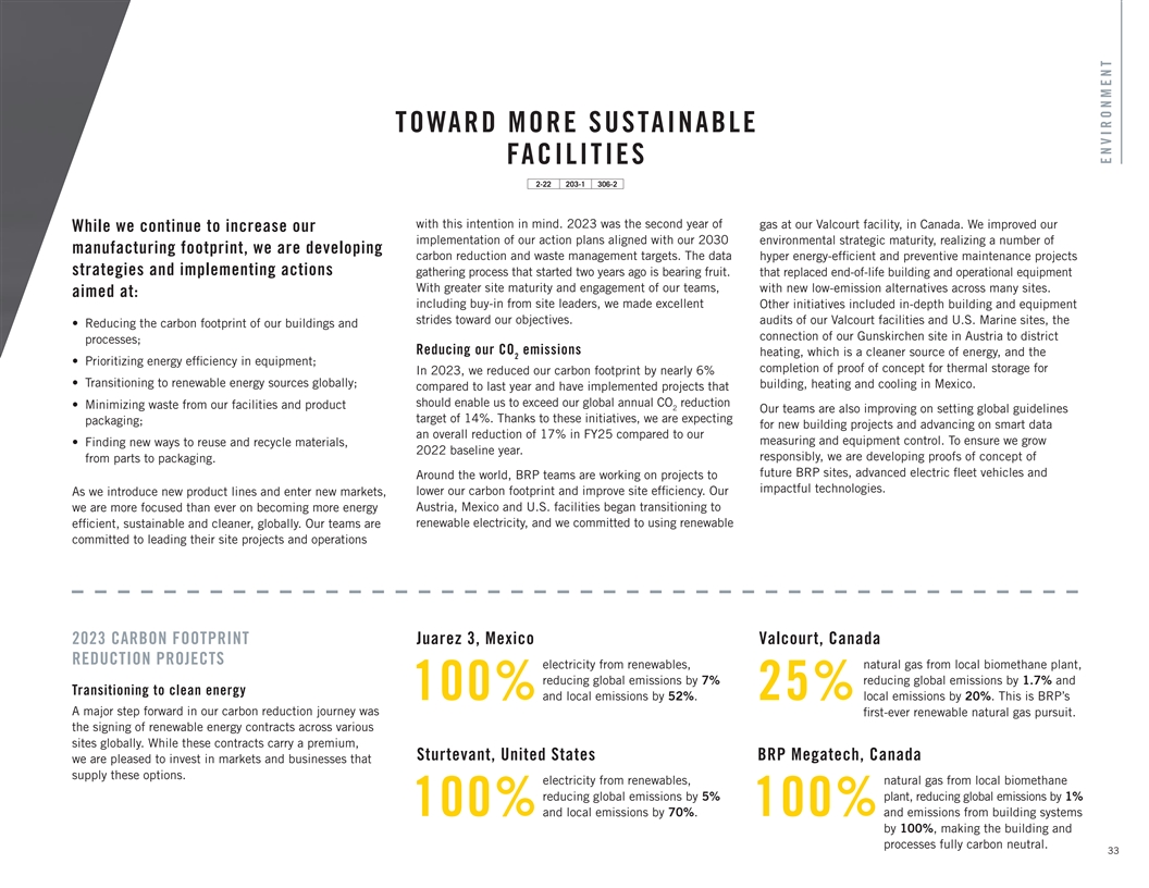 面向更可持续的设施2-22 203-1 306-2牢记这一意图。2023年是我们位于加拿大的Valcourt工厂的第二年天然气。我们改进了我们的虽然我们继续加强实施与2030年环境战略成熟度相一致的行动计划,实现了一些制造业足迹,但我们正在制定碳减排和废物管理目标。两年前开始的数据超节能和预防性维护项目战略和实施行动收集过程正在取得成果。它以更高的站点成熟度和我们团队的参与度取代了报废建筑和运营设备,在许多站点采用了新的低排放替代方案。旨在:包括站点领导者的支持,我们做出了出色的其他举措,包括深入建设和设备朝着我们的目标大步迈进。对我们的Valcourt设施和美国海洋站点的审计,The •减少我们建筑的碳足迹,并将我们在奥地利的Gunskirchen场地与区域流程相连接;减少我们的CO排放供暖,这是一种更清洁的能源,以及2 •优先考虑设备的能效;完成2023年热储存的概念验证,我们将碳足迹减少了近6% •在全球范围内过渡到可再生能源;建筑,墨西哥的供暖和制冷。与去年相比,已经实施的项目应该能够使我们超过我们的全球年度CO减少量•最大限度地减少我们的设施和产品产生的浪费2我们的团队也在制定14%的全球指导目标方面进行改进。由于这些举措,我们期待包装;对于新的建筑项目和在智能数据上的推进,与我们的测量和设备控制相比,25财年的总体减少17%。确保我们增长•寻找材料重复使用和回收的新方法,2022基准年。负责任地,我们正在开发从零件到包装的概念样张。未来的BRP场地、先进的电动车队车辆以及在世界各地,BRP团队正在开展项目,以影响技术。降低我们的碳足迹并提高场地效率。随着我们引入新的产品线并进入新的市场,奥地利、墨西哥和美国的设施开始过渡到我们比以往任何时候都更加专注于成为更多能源的可再生电力,我们致力于在全球范围内使用高效、可持续和更清洁的可再生能源。我们的团队致力于领导他们的现场项目和运营2023碳足迹Juarez 3,墨西哥Valcourt,加拿大减排项目来自可再生能源的电力、当地生物甲烷工厂的天然气,将全球排放量减少7%,将全球排放量减少1.7%,并100%过渡到清洁能源,将当地排放量减少52%。当地排放25%减20%。这是BRP在我们的碳减排之旅中向前迈出的重要一步,这是有史以来第一次可再生天然气的追求。在全球各个地点签署可再生能源合同。虽然这些合同带有溢价,但美国Sturtevant、加拿大BRP Megatech我们很高兴能够投资于提供这些选择的市场和企业。来自可再生能源的电力、来自当地生物甲烷的天然气使全球排放量减少5%的工厂,使全球排放量减少1% 100%,当地排放量减少70%。100%和建筑系统排放100%,使建筑和加工完全碳中和。33环境