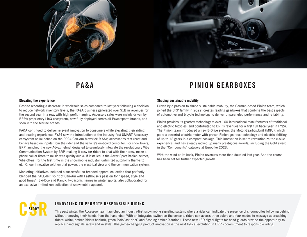 PA & A PINION GEARBOXES提升体验塑造可持续移动性尽管在塑造可持续移动性的热情的推动下,总部位于德国的PINION团队做出了一项决定,但与去年相比,批发销售额有所下降,该团队为了降低网络库存水平,PA & A业务在2022年加入了BRP家族,创造了超过10亿美元的收入,连续第二年创造出结合了最佳方面的领先变速箱,利润率很高。配件销售主要受汽车和自行车技术的推动,以提供无与伦比的性能和可靠性。BRP专有的LinQ生态系统,现已全面部署在所有Powersports品牌上,而Pinion则为超100家国际制造商提供其变速箱技术的传统很快就会进入海洋品牌。和电动自行车,并在24财年为BRP的第一个完整财年贡献了收入。PA & A继续向消费者提供相关创新,同时提升他们的骑行体验。Pinion团队推出了新的e-Drive系统,即Motor.Gearbox.Unit(MGU),该系统和划船体验。FY24推出了业界首创的SMART配件,将强大的电动机与经过验证的小齿轮变速箱技术和电动换挡生态系统配对,这是在2024 Can-Am Maverick R SSV上推出的,该配件具有反应性,在紧凑的封装中可达12个档位。这项创新将根据骑手和车辆车载计算机的输入,彻底改变电动自行车的行为方式。对于雪地爱好者来说,体验,并且已经收获了许多享有盛誉的奖项,包括金奖BRP在Eurobike 2023上推出了新款Advex头盔,旨在无缝集成“组件”类别中的革命性Vibe。Communication System by BRP,makes it easy for riders to chat with their crew,making a with the wind at its back,Pinion revenue last year toughed more than double last year。和课程电话或听音乐有质量的音频。If installed in the Advex Sport Radian helmet,has been set for further expected growth。Vibe首次在雪地摩托行业提供无限自主,这要归功于eLinQ,这是我们为电动遮阳板和通信系统提供动力的创新解决方案。营销举措包括一个成功的联合品牌服装系列,该系列将Can-AM的“ALL-IN”精神与Fasthouse对“速度、风格和美好时光”的热情完美融合。Ski-Doo和Kanuk这两个冬季运动中的标志性品牌,也合作推出了雪地摩托服装的独家限量系列。创新推动负责任的骑行故事在过去的这个冬天,配件团队推出了业界首创的雪地摩托信号系统,骑手无需将手从车把上移开,就可以在该系统中指示雪地摩托跟在CSR后面的存在。通过控制台上的集成开关,骑手可以访问三种颜色和四种模式来向接近的骑手发送消息:白色、琥珀色(骑手在后面)、绿色(单人/最后一名骑手)和闪烁的琥珀色(小心)。这些用于护手的新型LED信号灯提供了安全、时尚地更换手牌信号的机会。这一改变游戏规则的产品创新,是BRP对负责任骑行承诺的下一个逻辑演变。22