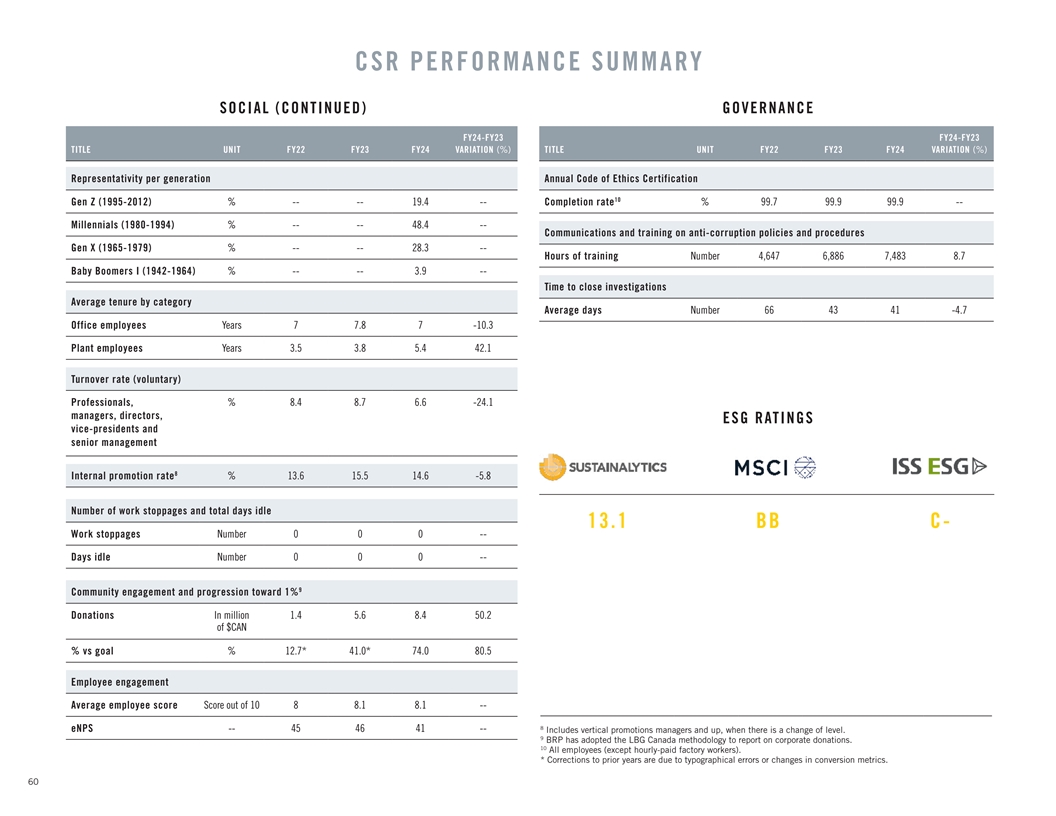 CSR绩效摘要社会(续)治理FY24-FY23 FY24-FY23标题单位FY22 FY23 FY24变动(%)标题单位FY22 FY23 FY24变动(%)每代代表性年度Code of Ethics认证10 GenZ(1995-2012)%---19.4--完成率% 99.7 99.9 99.9--千禧一代(1980-1994)%---48.4--关于反腐败政策的交流和培训和程序X世代(1965-1979)%---28.3--培训小时数4,6476,8867,4838.7婴儿潮一代I(1942-1964)%---3.9--结束时间调查按类别划分的平均任期平均天数664341-4.7办公室雇员年份77.87-10.3工厂雇员年份3.5 3.85.44 2.1更替率(自愿)专业人员,% 8.48.76.6-24.1经理、董事,ESG Ratings副总裁和高级管理人员8内部晋升率% 13.6 15.5 14.6-5.8停工次数和总闲置天数13.1 BB C-停工次数000--闲置天数000--9社区参与度和向1%的进展捐赠(百万)1.45.68.4 50.2美元CAN % vs目标% 12.7 * 41.0 * 74.08 0.5员工敬业度员工平均得分为1088.18.1-8 eNPS-454641--包括垂直晋升经理和向上,当水平发生变化时。9 BRP采用LBG加拿大方法报告企业捐赠情况。10全体员工(时薪工厂工人除外)。*对往年的更正是由于印刷错误或转换指标的变化。60