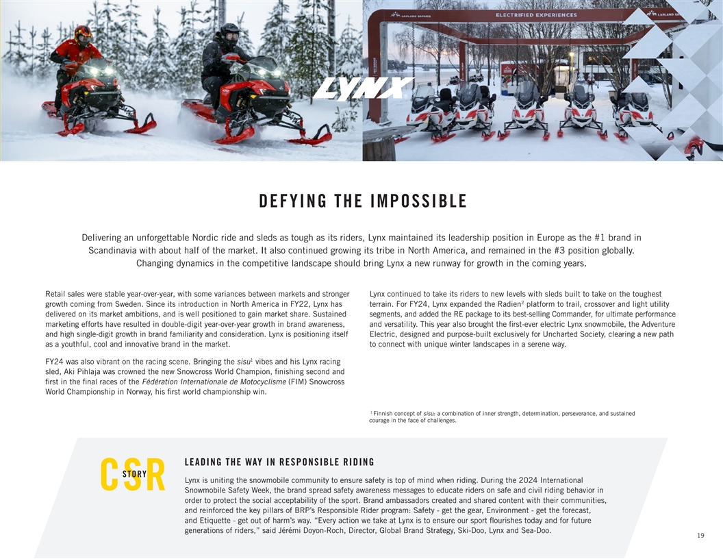 山猫无视不可能的情况,提供了令人难忘的北欧骑行和与骑手一样坚韧的雪橇,保持了其在欧洲的领导地位,成为斯堪的纳维亚半岛排名第一的品牌,拥有约一半的市场份额。它还继续在北美发展其部落,并保持在全球排名# 3的位置。竞争格局中不断变化的动态应该会为山猫在未来几年的增长带来新的跑道。零售销售同比稳定,市场之间存在一些差异,实力更强的Lynx继续将其骑手提升到新的水平,其雪橇旨在承接来自瑞典的最艰难的2增长。自22财年在北美推出以来,山猫拥有地形。对于24财年,Lynx将Radien平台扩展到Trail、Crossover和Light Utility,实现了其市场雄心,并处于有利地位,可以获得市场份额。持续细分市场,并在其畅销的Commander中加入了REE套件,为极致的性能营销努力带来了品牌知名度的两位数同比增长,以及多功能性。今年还带来了首款电动Lynx雪地摩托,The Adventure和品牌熟悉度和考虑度的高个位数增长。Lynx将自己定位为Electric,专为Uncharted Society设计和专门打造,为市场上年轻、炫酷、创新的品牌扫清了一条新路。以宁静的方式与独特的冬季景观连接。1 FY24在赛车舞台上也充满活力。Aki Pihlaja带着sisu的氛围和他的Lynx赛车雪橇,加冕了新一届斯诺克越野世界冠军,在挪威举行的国际摩托车自行车联合会(FIM)斯诺克越野世界锦标赛的决赛中获得第二名和第一名,这是他首次获得世界冠军。1芬兰sisu概念:内在力量、决心、毅力、面对挑战的持续勇气的结合。在负责任的骑行故事中领先山猫正在团结雪地摩托社区,确保安全是骑行时的首要考虑。在2024国际CSR雪地摩托安全周期间,该品牌传播安全意识信息,对骑手进行安全和文明的骑行行为教育,以保护这项运动的社会接受度。品牌大使创建并与他们的社区分享内容,并加强了BRP责任骑手计划的关键支柱:安全-获得装备,环境-获得预测,礼仪-摆脱伤害。Ski-Doo、Lynx和Sea-Doo全球品牌战略总监J é r é mi Doyon-Roch表示:“我们在Lynx采取的每一个行动都是为了确保我们的运动在今天和未来几代骑手中蓬勃发展。”19