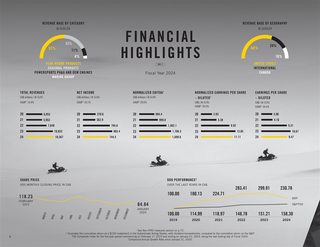 按类别划分的收入基础按地域划分的收入基础截至31/01/24的31/01/24财务33% 24% 52% 60% 11% 4% 16%突出显示全年产品美国201-1季节性产品国际动力运动PA & A和OEM引擎加拿大2024财年海运集团1总收入净收入正常化EBITDA正常化每股收益每股收益加利福尼亚州百万美元/截至31/0 1丨203.96 215,95321362.92 1999.02 15.39214.10 227,64822794.6221,462.12 29.92 229.31 10,033865.41,706.31 2.05 2310.672323232310,3671,699.61 1.1 19.47 2424744.52424242股价DOO业绩DOO过去几年的每月收盘价格,单位为加利福尼亚州美元,单位为加利福尼亚州 283.41 299.91 230.78 100.00 180.13 2 24.71 118.23 标普TERM3/TSX 84.84 2024年1月100.00 114.99 118.97 148.78 151.21 158.30 201920202021202220232图示了对具有投票权的次级股票进行100美元投资的累计回报率,其中包括股息再投资,相比之下,在从2019年2月1日开始到2024年1月31日(即2024财年的最后一个交易日)的五年期间,标普/ST TSX综合指数的累计回报率。8 *自2020年1月31日以来的复合年增长率。3月4月5月6月7月8月9月10月11月12月