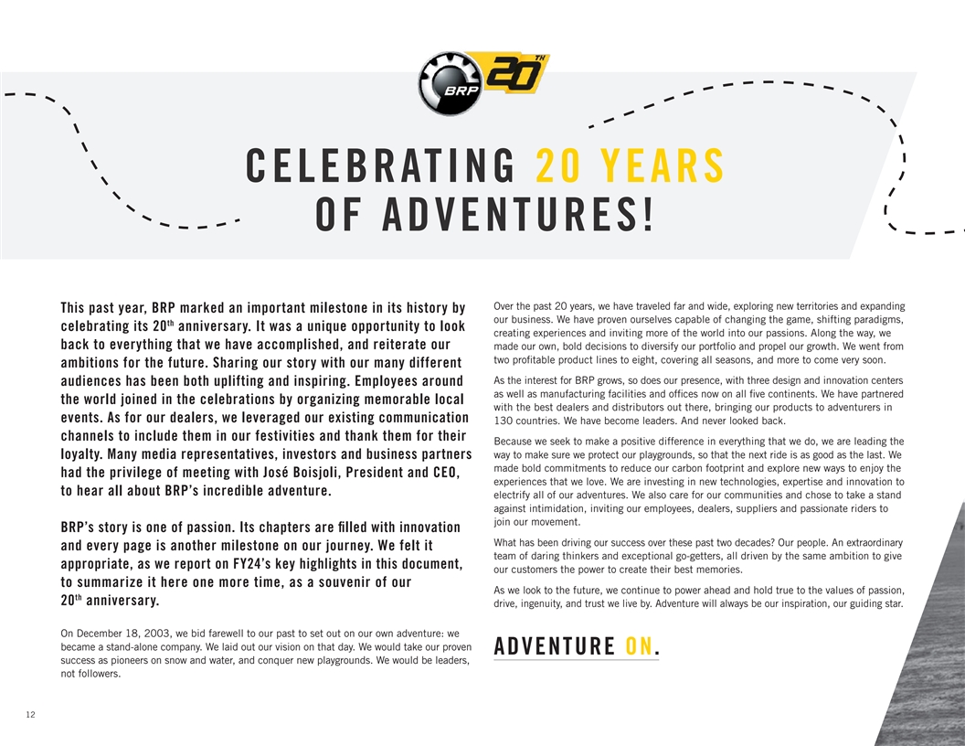 喜迎20年历险!20年不远万里,开拓新领域,不断拓展过去的这一年,BRP被我们的事业标志着其历史上的一个重要里程碑。我们已经证明自己有能力改变游戏规则,改变范式,庆祝成立20周年。这是一个独特的机会,可以看到创造体验并邀请更多的世界进入我们的激情。在此过程中,我们会回到我们所取得的一切成就,并重申我们做出了自己的大胆决定,以使我们的投资组合多样化并推动我们的增长。我们从两个盈利的产品线到八个,覆盖所有季节,更多即将到来。对未来的野心。与我们的许多不同人分享我们的故事随着人们对BRP的兴趣与日俱增,我们的存在也在增加,拥有三个设计和创新中心的观众既令人振奋又鼓舞人心。周围的员工以及现在在所有五大洲的制造设施和办公室。我们与全世界一起参加了庆祝活动,与最好的经销商和分销商一起组织了令人难忘的当地活动,在活动中将我们的产品带给冒险家。至于我们的经销商,我们利用了我们现有的通讯130个国家。我们已经成为领导者。并且从未回头。渠道将他们包括在我们的庆祝活动中并感谢他们的因为我们寻求在我们所做的每一件事上产生积极的变化,我们正在带头确保我们保护我们的操场,以便下一次骑行和最后一次一样好。我们忠诚。许多媒体代表、投资者和商业伙伴做出了大胆的承诺,以减少我们的碳足迹并探索新的享受方式,有幸与总裁兼首席执行官José Boisjoli会面,体验我们喜爱的体验。我们正在投资于新技术、专业知识和创新,以收听有关BRP令人难以置信的冒险的所有信息。为我们所有的冒险之旅通电。我们还关心我们的社区,并选择采取反对恐吓的立场,邀请我们的员工、经销商、供应商和热情的骑手加入我们的运动。BRP的故事是关于激情的。它的篇章充满了创新在过去的二十年里,是什么推动了我们的成功?我们的人。不平凡的每一页,都是我们征程上的又一座里程碑。We felt it team of daring thinkers and exceptional getters,all driven by the same ambition to give appropriate,as we reported on FY24’s key highlights in this document,our customers the power to create their best memories.在这里再总结一遍,作为我们展望未来时的纪念品,我们继续向前发力,坚守激情的价值观,the 20 anniversary. drive,ingenuity,and trust we live by。冒险永远是我们的灵感,是我们的指导之星。2003年12月18日,我们告别过去,开始自己的冒险之旅:我们成为了一家独立的公司。我们在那一天布局了我们的愿景。我们将把我们经过验证的冒险作为雪上和水上的先驱,并征服新的游乐场。我们将是领导者,而不是追随者。12