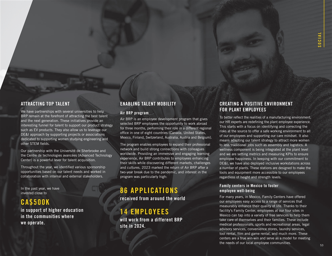 吸引顶级人才使能人才流动性为工厂员工创造积极的环境我们与几所大学建立了合作关系,以帮助Air BRP计划BRP保持在吸引最佳人才的最前沿,以更好地反映制造环境的现实。Air BRP是一项赋予和下一代的员工发展计划。这些举措提供了一个我们的人力资源专家正在重新定义工厂员工体验。选定的BRP员工有机会出国工作有趣的人才漏斗,以支持我们的产品战略这首先从三个月的重点识别和纠正开始,在不同的地区发挥他们的作用,例如EV产品。它们还使我们能够在源头上利用我们的风险,通过支持员工的项目或协会并支持我们的关怀心态,为八个国家之一的所有办公室(加拿大、美国、DE & I方法)提供安全的工作环境。它还包括墨西哥、芬兰、瑞士、澳大利亚、奥地利和比利时)。致力于支持学习工程的女性,并意味着调整我们的人才战略,以吸引更多女性进入其他STEM领域。该计划使员工能够将他们的专业扩展到组装和物流等不太传统的工作。一个网络并与同事建立强大的联系健康组件正在工厂层面整合我们与舍布鲁克大学和世界各地的合作伙伴关系。提供身临其境、引人入胜的学习,我们正在设定衡量标准和衡量KPI,以确保Centre de technologies avanc é es(先进技术体验,Air BRP有助于员工提高员工幸福感。与我们对Center)的承诺保持一致,是人才获取的强大杠杆。他们的技能在发现不同市场的同时,挑战了DE & I,我们也在全年部署了包容性工作站,我们确定了各种赞助和文化。2023年标志着在多家工厂之后,Air BRP的回归。这些工作站旨在让我们的机会基于我们的人才需求,并且由于大流行而在两年的休息时间内工作,并且我们的员工与内部和外部利益相关者协作,更容易获得对工具和设备的兴趣。该计划特别高:无论身高和力量水平。在墨西哥的家庭中心要扶植在过去的一年里,我们有员工福利86应用程序投资接近多年,在墨西哥,家庭中心提供了从世界各地收到的我们的员工轻松获得一系列服务,这些服务让加利福尼亚州 50万美元,显着提高了他们的生活质量。多亏了他们设施的家庭中心,我们四个站点的员工在支持高等教育14名员工墨西哥可以利用各种免费服务,在照顾自己和家人的社区帮助他们。其中包括将工作从我们运营的不同BRP。医疗专业人员、运动休闲区域、2024年法律网站。咨询服务、便利店、洗衣服务、工具租赁、影视游戏租赁等等。这些中心是真正的双赢,是满足我们当地员工社区需求的典范。53社会
