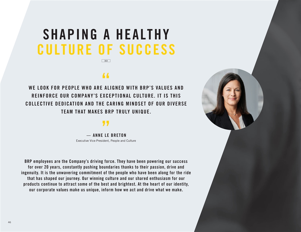 塑造成功的健康文化3-3我们寻找与BRP价值观一致并加强我们公司非凡文化的人。正是这种集体的奉献精神和我们多元化团队的细心心态,让BRP变得真正独特。-ANNE LE BRETON执行副总裁,人与文化BRP员工是公司的驱动力。20多年来,他们一直为我们的成功提供动力,由于他们的热情、干劲和独创性,不断突破界限。正是一路同行的人们坚定不移的承诺,塑造了我们的征程。我们的制胜文化和我们对产品的共同热情继续吸引着一些最优秀和最聪明的人。在我们身份的核心,我们的企业价值观使我们与众不同,告知我们如何行动,并推动我们所做的事情。46