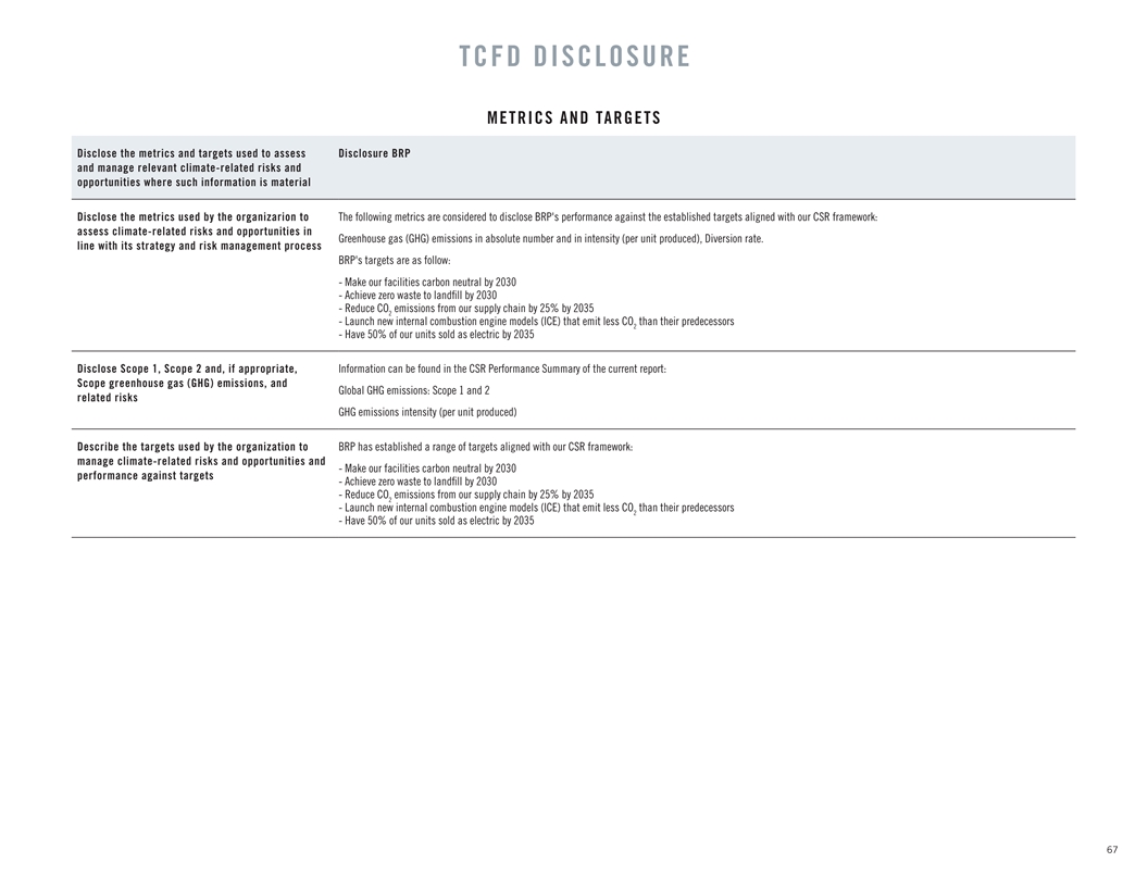 TCFD披露指标和目标披露了用于评估披露BRP和管理相关气候相关风险和机会的指标和目标,如果此类信息具有重大意义,则披露组织对以下指标使用的指标被视为披露了BRP相对于与我们的CSR框架一致的既定目标的绩效:以绝对数量和强度(每生产单位)评估温室气体(GHG)排放中与气候相关的风险和机会,分流率。符合其战略和风险管理流程的BRP的目标如下:-到2030年使我们的设施实现碳中和-到2030年实现零垃圾填埋-到2035年将我们供应链的CO排放量减少25% 2-推出新的内燃机型号(ICE),其CO排放量低于其前身2-到2035年让我们50%的机组以电动方式销售披露范围1、范围2,如适用,信息可在当前报告的CSR绩效摘要中找到:范围温室气体(GHG)排放,和全球GHG排放:范围1和2相关风险GHG排放强度(每单位产量)描述组织使用的目标对于BRP建立了一系列与我们的CSR框架一致的目标:管理与气候相关的风险和机会,以及-到2030年使我们的设施达到碳中和的绩效目标-到2030年实现零垃圾填埋-到2035年将我们供应链的CO排放减少25% 2-推出新的内燃机型号(ICE)比他们的前辈排放更少的二氧化碳2-到2035年让我们50%的机组以电动方式销售67