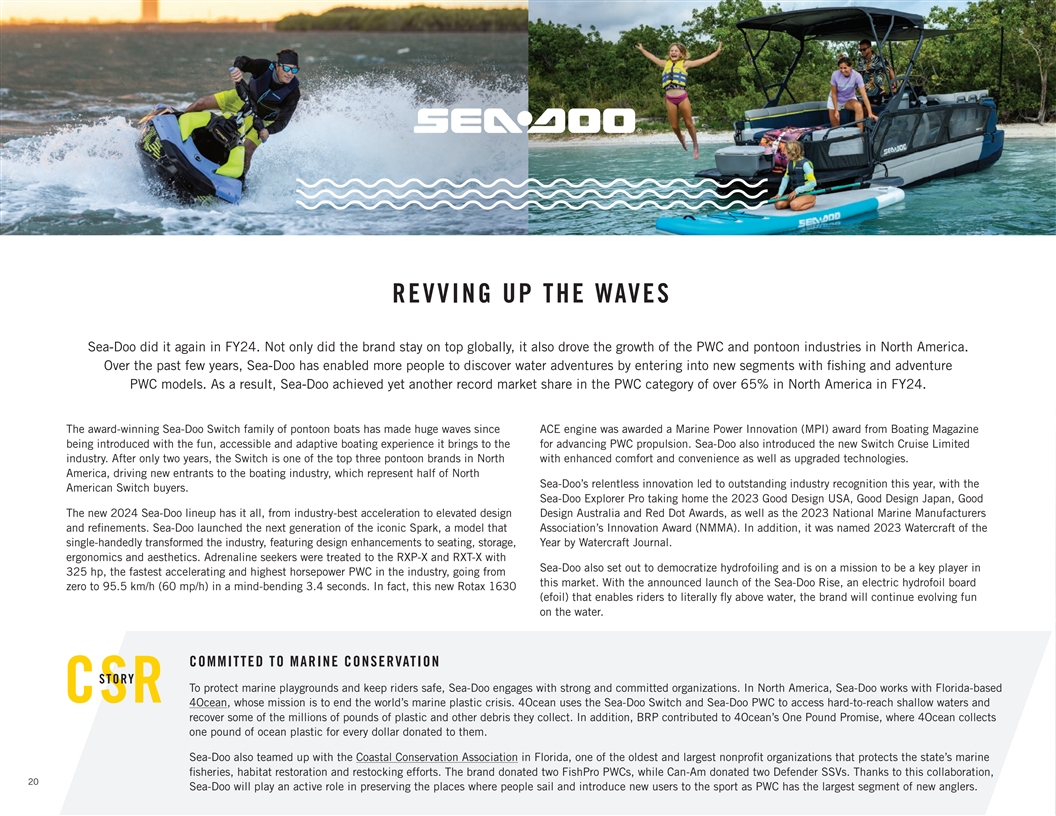 Reving up the WAVES Sea-Doo在24财年再次做到了。该品牌不仅在全球保持领先,还带动了PWC和浮桥行业在北美的增长。在过去几年中,Sea-Doo通过与钓鱼和冒险PWC模型一起进入新的细分领域,使更多人能够发现水上冒险。因此,Sea-Doo在PWC类别中的市场份额在24财年北美再创历史新高,超过65%。自ACE发动机获得Boating Magazine颁发的海洋动力创新(MPI)奖以来,屡获殊荣的Sea-Doo Switch浮舟船家族掀起了巨大的波澜,它为推进PWC推进带来了有趣、方便和自适应的划船体验。Sea-Doo还推出了全新的Switch Cruise Limited行业。时隔仅两年,Switch凭借增强的舒适性和便利性以及升级的技术,跻身北方三大浮桥品牌之列。美国,推动划船行业的新进入者,这代表了北海的一半-Doo的不懈创新导致今年的行业认可度非常高,美国的Switch买家。Sea-Doo Explorer Pro带回家2023 Good Design USA,Good Design Japan,Good The new 2024 Sea-Doo阵容应有尽有,从行业最佳加速到提升设计澳大利亚和红点奖,以及2023国家海洋制造商和精制。Sea-Doo推出了下一代标志性Spark,这是该协会创新奖(NMMA)的一款车型。此外,它被命名为2023单手改造行业的Watercraft,其特点是座椅、存储、Year by Watercraft Journal的设计增强。人体工程学和美学。肾上腺素寻求者接受了RXP-X和RXT-X的治疗,Sea-Doo也着手实现水翼化的民主化,其使命是成为来自这个市场的325马力的关键参与者,这是业内加速最快、马力最高的普华永道。随着Sea-Doo Rise的宣布推出,电动水翼板在令人费解的3.4秒内从零加速到95.5 km/h(60 mp/h)。事实上,这款新的Rotax 1630(eFoil),让骑手们能够在水面上飞翔,该品牌将继续在水面上进化乐趣。Sea-Doo致力于海洋保护故事,以保护海洋游乐场并保证骑手的安全,Sea-Doo与强大和忠诚的组织合作。在北美,Sea-Doo与总部位于佛罗里达州的CSR 4Ocean合作,后者的使命是结束世界海洋塑料危机。4Ocean使用Sea-Doo Switch和Sea-Doo PWC进入难以到达的浅水区,并回收他们收集的数百万磅塑料和其他碎片中的一部分。此外,BRP还为4Ocean的一磅承诺做出了贡献,其中4Ocean每捐赠给他们1美元,就会收集1磅海洋塑料。Sea-Doo还与佛罗里达州海岸保护协会合作,该协会是历史最悠久、规模最大的非营利组织之一,负责保护该州的海洋渔业、栖息地恢复和补给工作。该品牌捐赠了两辆FishPro普华永道,而Can-AM则捐赠了两辆Defender SSV。由于此次合作,20 Sea-Doo将发挥积极作用,保护人们航行的地方,并为这项运动引入新用户,因为普华永道拥有最大的新垂钓者细分市场。