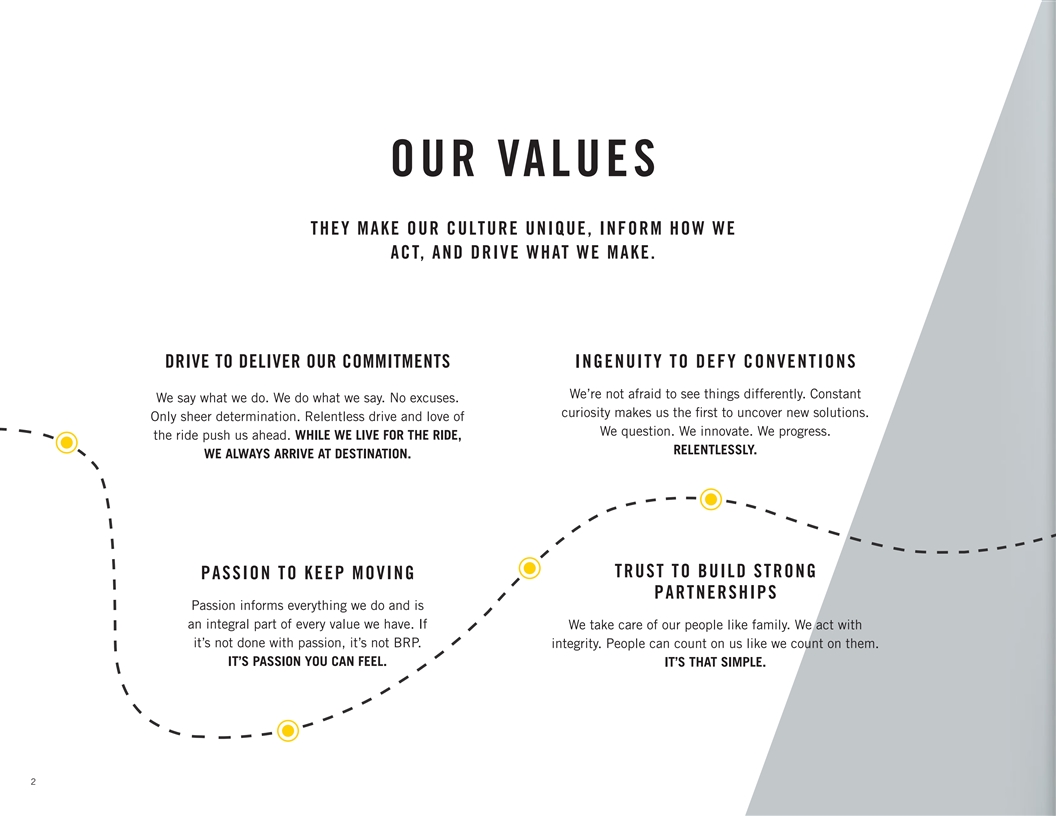 我们的价值观他们让我们的文化变得独特,告知我们如何行动,并推动我们所做的。驱动交付我们的承诺的精气神来挑战公约我们并不害怕以不同的方式看待事情。Constant We say what we do。我们说到做到。没有任何借口。好奇心使我们成为第一个发现新解决方案的人。只有纯粹的决心。不懈的驱动和热爱我们的质疑。我们创新。我们前进。顺风车推动我们前进。当我们为骑行而活时,不屈不挠。我们总是到达目的地。信任建立强大的热情以保持不断变化的伙伴关系热情告知我们所做的每一件事,并且是我们所拥有的每一种价值观的组成部分。如果我们像家人一样照顾我们的人。我们用它行动不是用激情完成的,这不是BRP。诚信。人们可以像依靠他们一样依靠我们。这是你能感受到的激情。就是这么简单。2