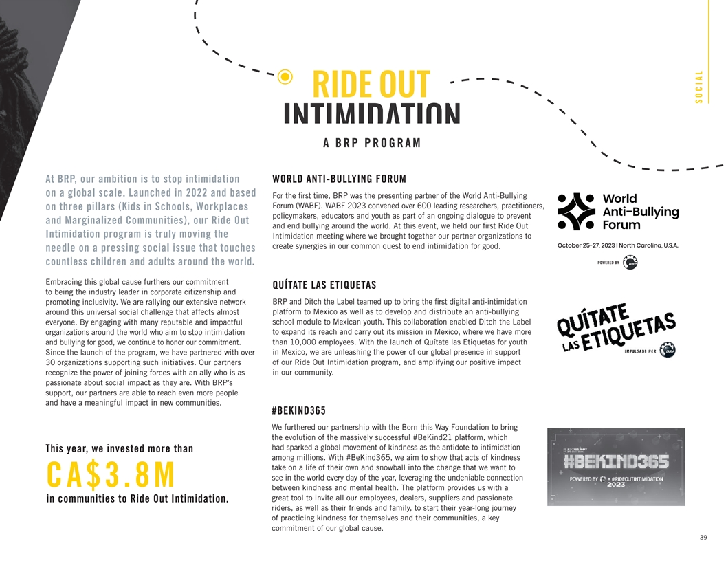 在BRP,我们的雄心是在全球范围内停止恐吓世界反欺凌论坛。BRP成立于2022年,首次立足于此,是世界反欺凌论坛(WABF)的展示合作伙伴。WABF 2023召集了600多名领先的研究人员和从业者,讨论了三大支柱(学校里的孩子、工作场所的政策制定者、教育工作者和青年,作为防止和边缘化社区的持续对话的一部分),我们在世界各地的骑行和结束欺凌行为。在此次活动中,我们举办了首个Ride Out恐吓计划,这是真正让我们将合作伙伴组织聚集到2023年10月25日至27日的恐吓会议。美国北卡罗来纳州在我们共同寻求结束向善恐吓的过程中创造协同效应。针在一个紧迫的社会问题上,这个问题触动了全世界无数儿童和成年人的力量。拥抱这一全球事业,进一步推动了我们对成为企业公民和促进包容性的行业领导者的QU í TATE LAS ETIQUETAS的承诺。我们正在集结我们广泛的网络BRP和Ditch the Label联手,围绕这一影响几乎是平台的普遍性社会挑战,为墨西哥带来了第一个数字反恐吓以及开发和分发一个反欺凌每个人。通过与许多有信誉和有影响力的学校模块接触墨西哥青年。这一合作使全球各地旨在阻止恐吓的Label组织得以抛弃,以扩大其影响范围,并在墨西哥执行其使命,在那里我们拥有更多并永远霸凌,我们继续履行我们的承诺。超过10,000名员工。随着面向青年的Qu í tate las Etiquetas的启动,自该计划启动以来,我们在墨西哥与over合作,我们正在释放我们全球存在的力量,以支持30个支持此类倡议的组织。我们Ride Out恐吓计划的合作伙伴,并放大我们的积极影响,认识到与我们社区中的盟友联手的力量。对社会影响充满热情,因为他们是。在BRP的支持下,我们的合作伙伴能够接触到更多的人,并在新的社区中产生有意义的影响。# BEKIND365我们进一步与Born this Way基金会建立合作伙伴关系,带来了大获成功的# BeKind21平台的演变,该平台曾引发全球善举运动,作为恐吓的解药,今年我们的投资超过了数百万。通过# BeKind365,我们旨在展示善举呈现出属于自己的生活,并滚雪球般滚入一年中每一天我们都希望在世界上看到的变化,利用善举与心理健康之间不可否认的联系加利福尼亚州 380万美元。该平台为我们提供了一个很棒的工具,可以邀请我们所有的员工、经销商、供应商和社区中的热情人士一起骑出恐吓。骑手,以及他们的朋友和家人,开始他们为期一年的为自己和社区践行善意的旅程,这是我们全球事业的关键承诺。39社会