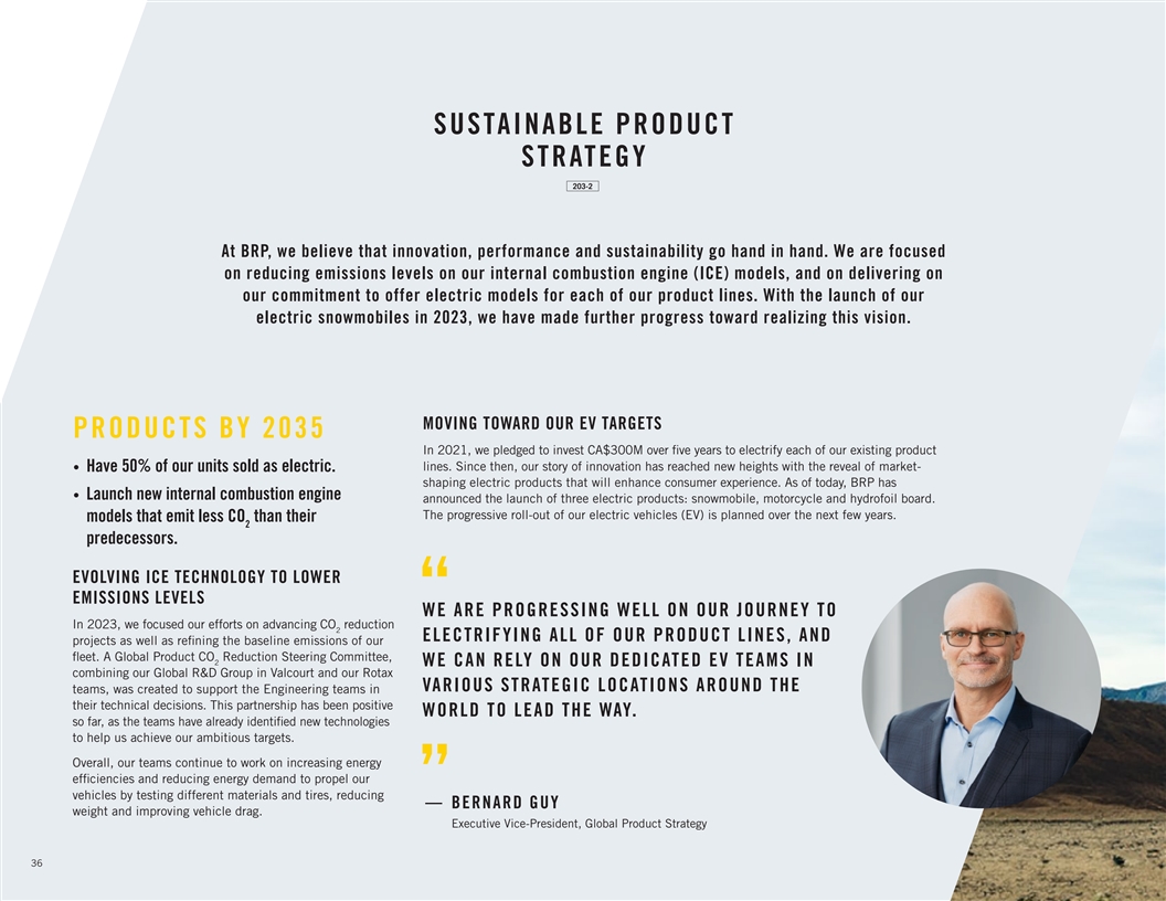 可持续产品战略203-2在BRP,我们认为创新、业绩和可持续性是齐头并进的。我们专注于降低我们的内燃机(ICE)车型的排放水平,并致力于兑现我们为我们的每个产品线提供电动车型的承诺。随着2023年我们的电动雪地摩托的推出,我们朝着实现这一愿景取得了进一步的进展。在2021年朝着到2035年的电动汽车目标产品迈进时,我们承诺在五年内投资加利福尼亚州 3亿美元,以实现我们现有的每一条产品线的电气化。从那时起,我们的创新故事随着市场的揭示达到了新的高度-•让我们50%的单位作为电动销售。塑造将提升消费者体验的电动产品。截至今日,BRP已•推出新型内燃机宣布推出三款电动产品:雪地摩托、摩托车和水翼板。我们计划在未来几年内逐步推出我们的电动汽车(EV)。排放的CO低于其2个前身的车型。不断发展的ICE技术以降低排放水平我们在到2023年的旅程中进展顺利,我们集中精力推进CO reduction 2使我们所有的产品线电气化,以及项目以及改进我们车队的基线排放。一个全球产品CO减少指导委员会,2我们可以依靠我们专门的电动汽车团队,将我们在Valcourt的全球研发团队和我们在团队周围的Rotax各种战略地点结合起来,旨在支持工程团队的技术决策。这种伙伴关系一直是积极的世界领先方式。到目前为止,因为各团队已经确定了新技术,以帮助我们实现雄心勃勃的目标。总体而言,我们的团队继续致力于提高能源效率和减少能源需求,通过测试不同的材料和轮胎来推动我们的车辆,减轻-伯纳德·盖伊的重量并改善车辆阻力。全球产品战略执行副总裁36