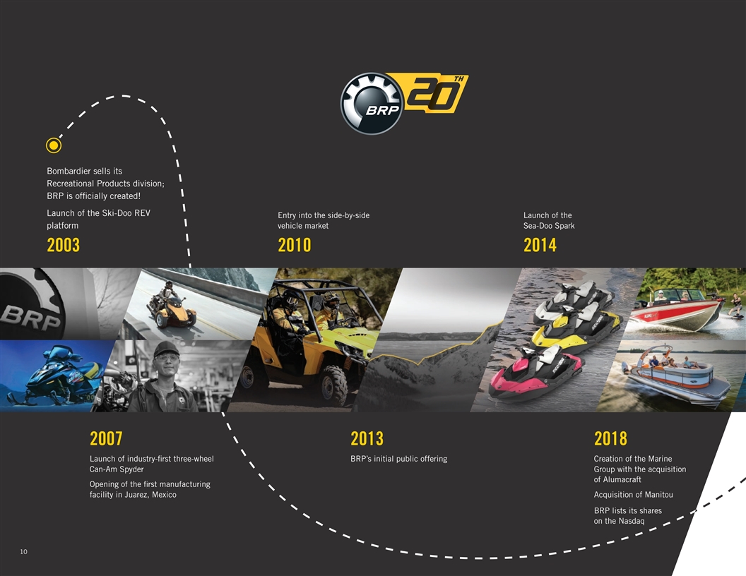 庞巴迪出售旗下娱乐产品部门;BRP正式创建!推出Ski-Doo REV进入并排推出平台车辆市场Sea-Doo Spark 200320102014200720132018推出业界首创的三轮BRP首次公开募股创建的Marine Can-Am Spyder Group以收购Alumacraft Opening在墨西哥华雷斯的第一家制造工厂收购Manitou的BRP其股票在纳斯达克上市10