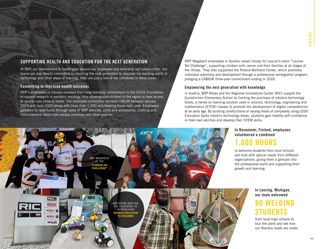 位于魁北克的BRP Megatech员工为Leucan的活动“Leucan为下一代滑雪挑战赛支持健康和教育”筹集资金,支持癌症儿童及其各个阶段的家庭。在BRP,我们对健康的承诺超越了我们的员工,也拥抱了我们的社区。我们的病。他们还支持罗兰-伯特兰中心,该中心促进团队也深深致力于通过专业的重返社会计划、技术和其他学习领域,激励下一代发现个人自主和发展的激动人心的世界。以下是我们在这些领域的一些举措。承诺提供截止于2026年的6万美元的三年承诺,即加利福尼亚州。致力于改善健康结果,为拥有知识的下一代赋能BRP在加拿大的员工重申了他们对奥地利CHUS基金会、BRP-Rotax和区域创新中心(RIC)的长期承诺,以支持儿科肿瘤学研究,从而允许该地区生病的儿童通过资助购买机器人技术到离家近的优质护理,进入Gunskirchen小学。该员工委员会在1月份的盒子之间汇出了加利福尼亚州 100万美元,这是一种用于科学、技术、工程以及2019年和2023年6月的动手学习解决方案,每年还有超过1,000个志愿服务小时。员工数学(STEM)课程以促进数字能力的发展而聚集起来,通过销售BRP车辆、零配件、服装和在幼年筹集资金。通过使用来自过剩库存和其他来源的乐高杂项来建造复杂程度不同的建筑。教育秒杀机器人技术盒子,学生获得对自己能力的健康自信,发展自己的STEM技能。在芬兰的罗瓦涅米,员工们志愿服务了总计1000小时,以迎接来自当地学校的学生和来自不同BRP MEGATECH组织的有特殊需求的孩子,让他们一窥职业世界,并支持他们“‘LUCAN SKI Challenge’”的成长和学习。在密歇根州的兰辛,我们的团队迎来了BRP-ROTAX和致力于向当地高中的孩子们介绍科学教育学生的60位焊接RIC参观工厂,看看我们的Manitou船是如何制造的。45社会