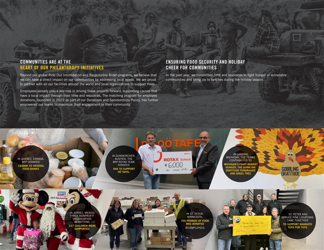 社区正处于确保粮食安全和节日核心的我们的慈善倡议为社区欢呼超越我们的全球驱赶恐吓和负责任的骑手计划,我们相信,在过去的一年里,我们投入时间和资源与弱势群体的饥饿作斗争,我们可以通过解决当地的需求对我们的社区产生直接影响。我们是引以为豪的社区,并在节日期间为家庭带来欢乐。与我们在世界各地的所有设施和当地组织合作,为他们提供支持。员工已经在推动这些项目向前发展方面发挥了关键作用,通过他们的时间和资源支持对当地产生影响的事业。作为我们捐赠和赞助政策的一部分,于2023年推出的员工捐赠匹配计划进一步增强了我们团队的能力,以最大限度地提高他们在社区中的参与度。在密西根州的甘斯基兴,加拿大魁北克、奥地利的球队,为BRP捐款的BRP-ROTAX球队米其根的对抗捐赠了8万美元用于几次饥饿,这家疯狂的食品银行提供了6000欧元,用于支持在圣彼得、圣彼得和圣彼得的墨西哥华雷兹的Gratitude Fundraiser O ö tafel和Angel Tree三个非营利组织MINNESOTA、SPRUCE PINE Local