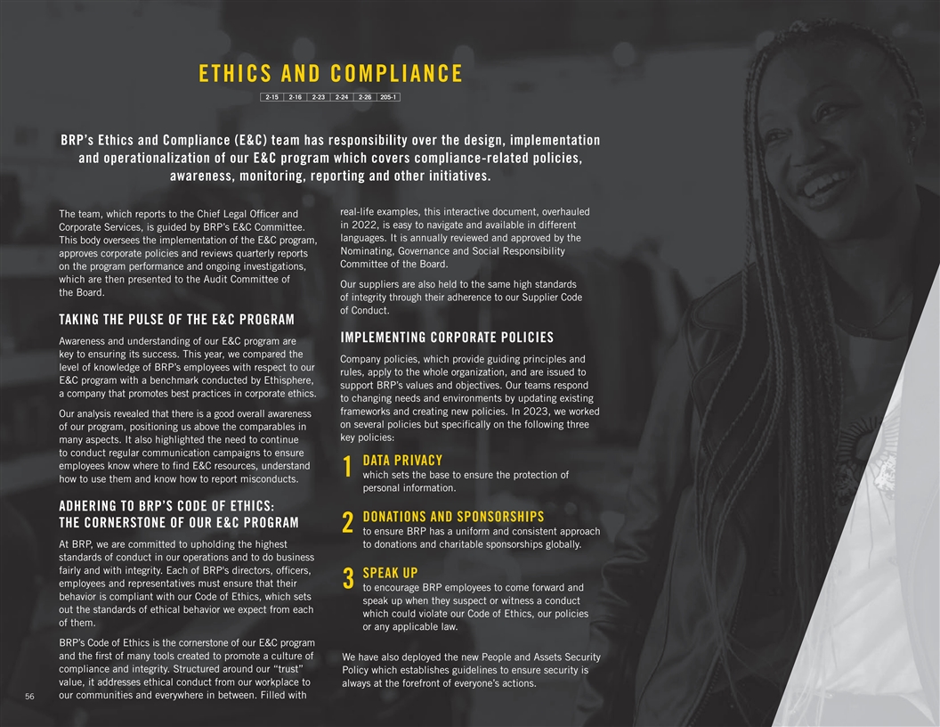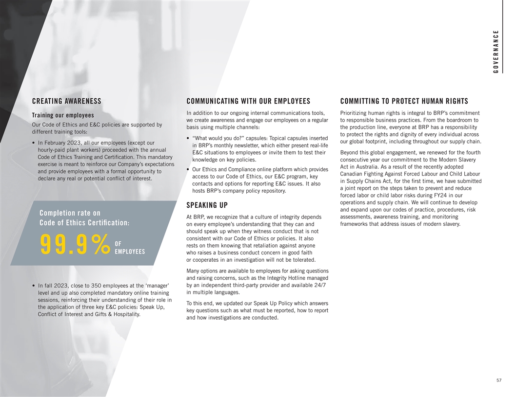 治理加强负责任的治理在BRP,我们致力于以最高的诚信水平开展我们的业务活动。2023年,我们继续建立有效的结构、政策、标准和沟通,以保持负责任治理所需的透明度和问责制。我们新成立的CSR指导委员会和CSR协调委员会加强了CSR25计划的执行。继去年推出新的道德守则后,我们继续以新的政策、资源和具体培训投资于负责任的治理。例如,我们过度使用的speak up政策是一个强大的工具,可以促进员工在任何情况下都能感到安全地提出问题或提出关切的环境。-Martin LANGELIER首席法务官和企业服务54