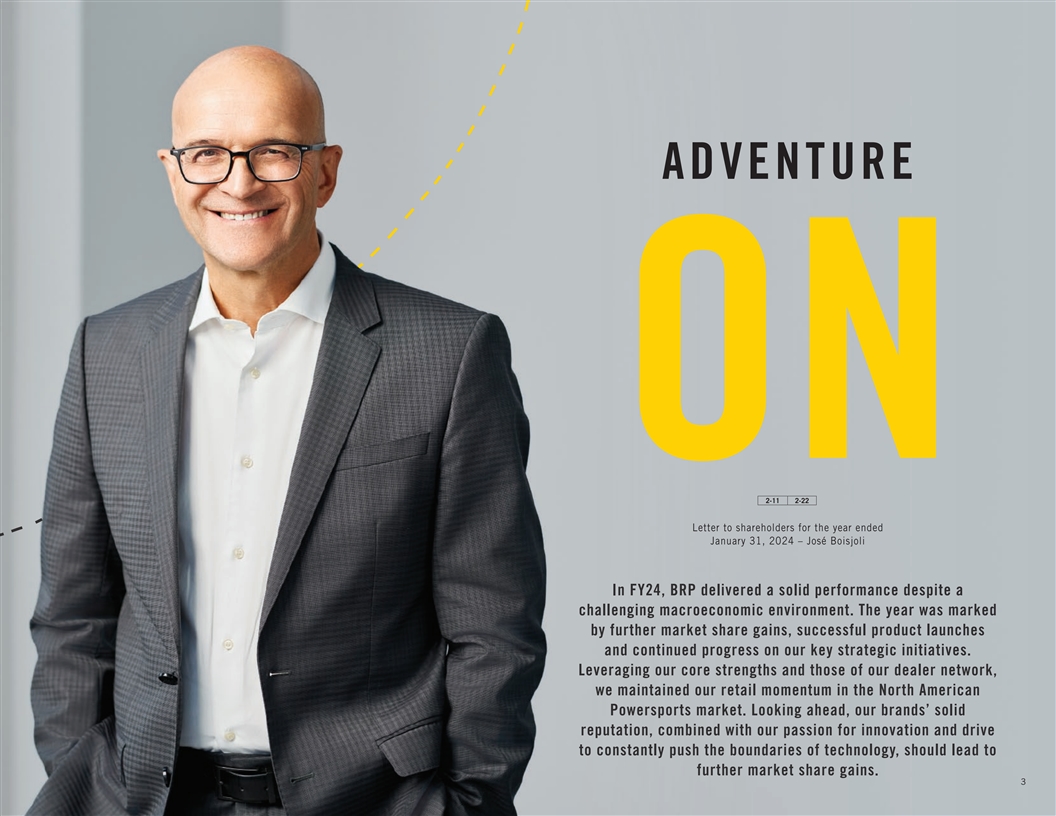 冒险2-11 2-22致股东的信截至2024年1月31日止年度– José Boisjoli在24财年,尽管宏观经济环境充满挑战,BRP仍取得了稳健的业绩。这一年的特点是进一步获得市场份额、成功推出产品以及我们关键战略举措的持续进展。凭借我们的核心优势和经销商网络的优势,我们保持了在北美Powersports市场的零售势头。展望未来,我们品牌的稳固声誉,加上我们对创新的热情和不断突破技术边界的动力,应该会带来进一步的市场份额增长。3
